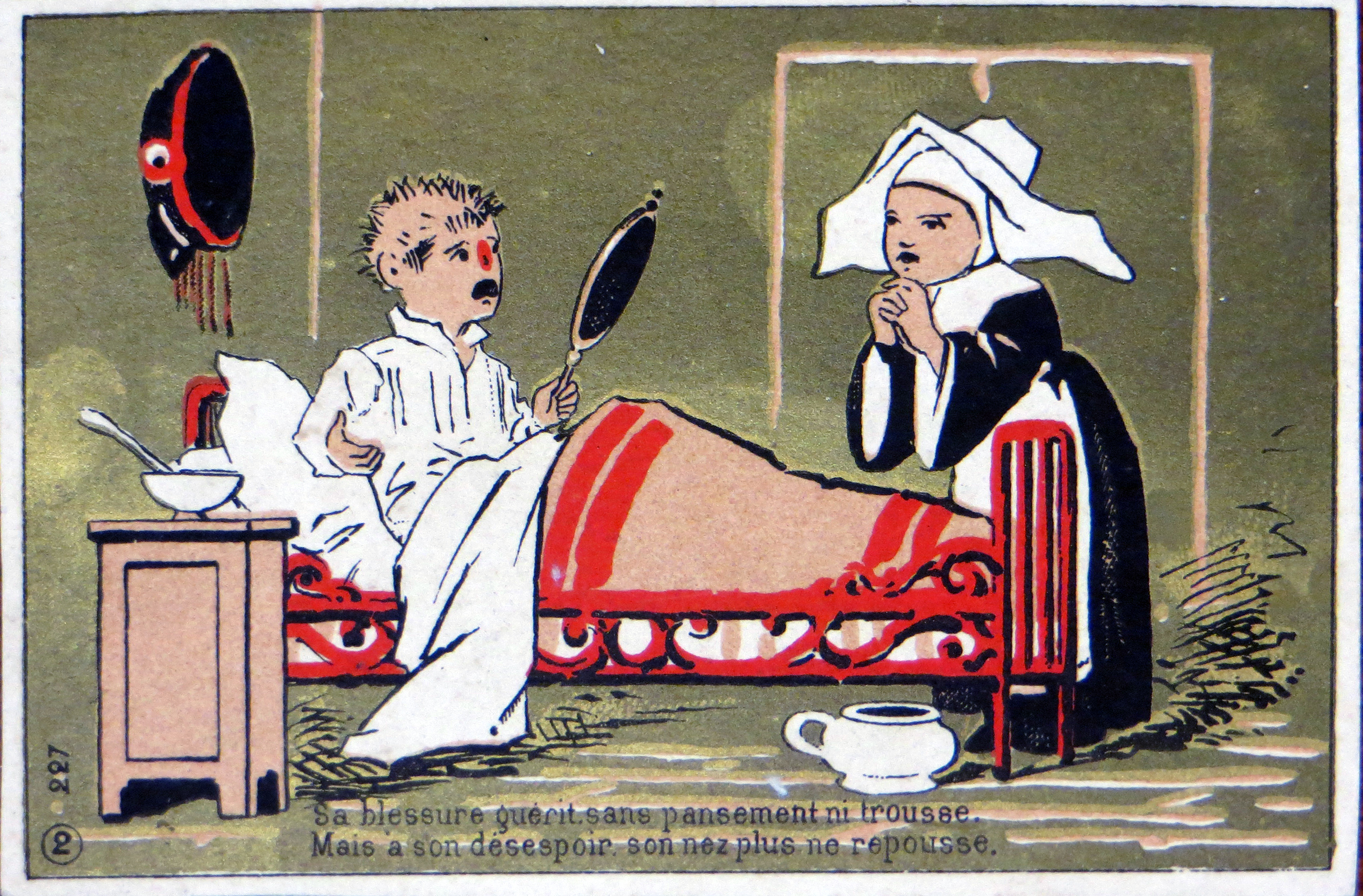 Text: His wound heals without dressing or kit but to his despair his nose does not grow back