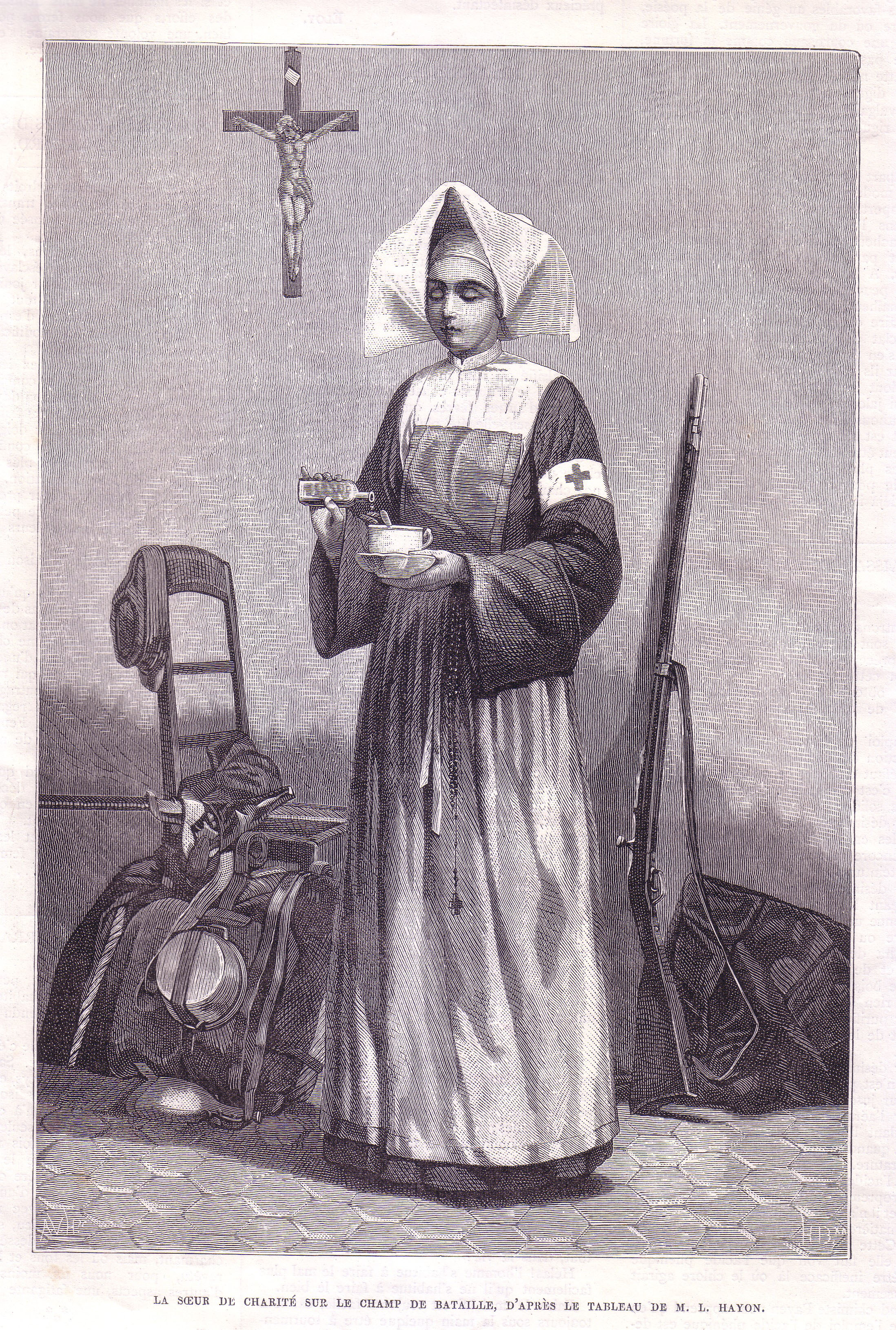 French text: "The Sister of Charity on the Battlefield, after the painting by Mr. L. Hayon."