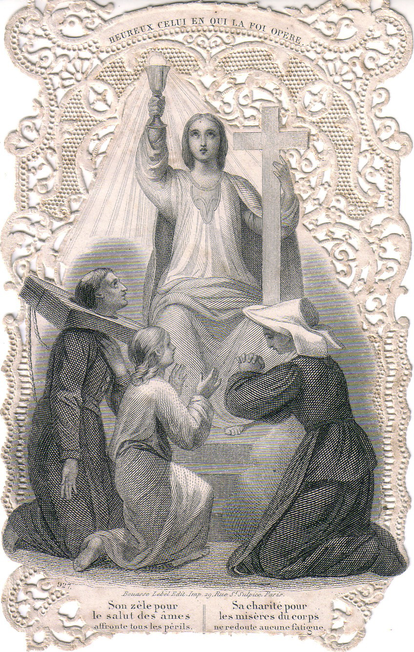 DePaul University collection; Sister, child, priest (Perboyre?) with Chinese instrument of punishment.