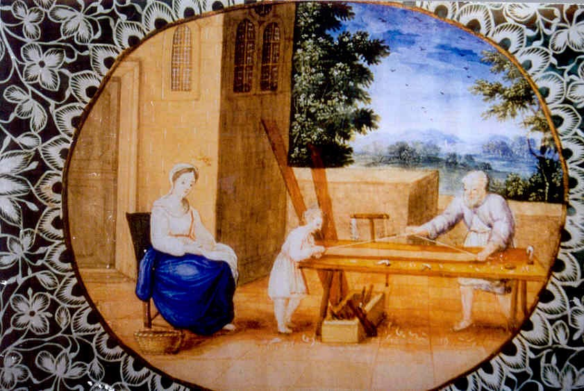 Miniature painting by Louise de Marillac, the Holy Family of Jesus, Mary, Joseph (working as a carpenter). Original at Daughters of Charity mother house, Paris