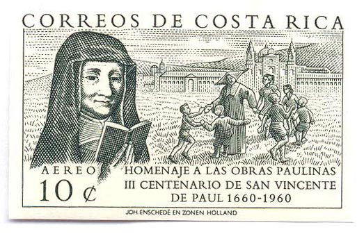 Unperforated, 10 centavos; Louse de Marillac holding small book; Sister and children playing; building in background; at DePaul University; printed in Holland