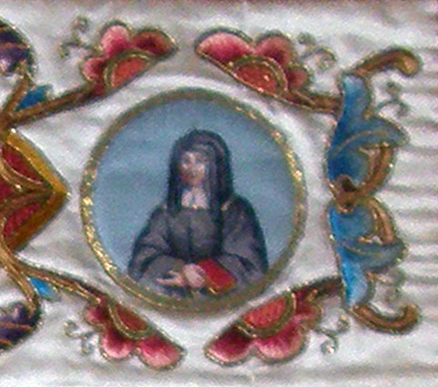 Embroidered roundel, Louise de Marillac (without halo), holding red book; from embroidered chasuble in CM mother house library, Paris