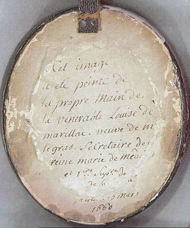 Text: This image was painted by the very hand of the Venerable Louise de Marillac, widow of M. Legras, secretary of Queen Marie de Medicis, and first superioress of [the Company], died 15 March 1660
