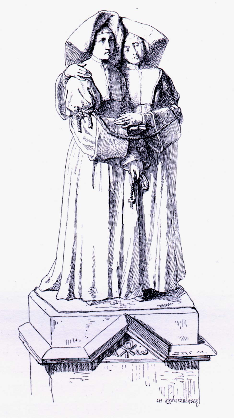 Soeurs Marie-Anne et Odile, Filles de la Charite d'Angers, se rendant au suplice.Sculture de M. Choyer, à Avrillé, près d'Angers