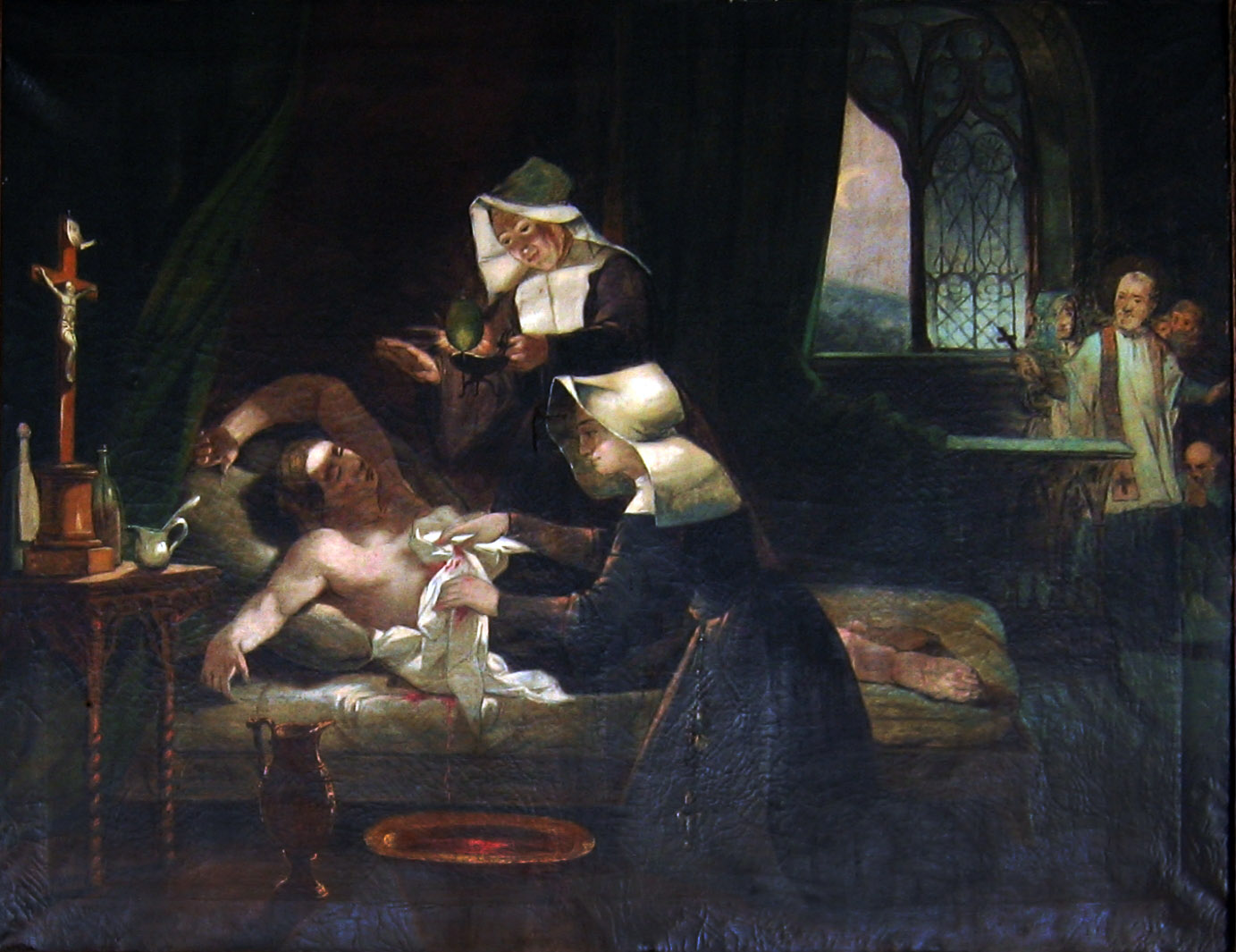 Vincent de Paul, holding crucifix, in background, with other figures; at night; original in provincial house, Daughters of Charity, Warsaw
