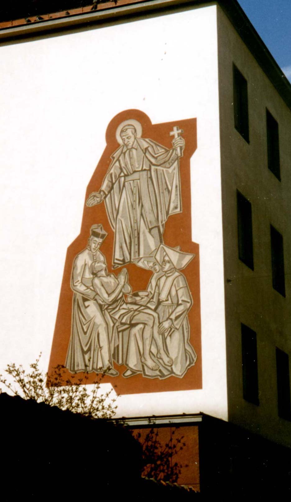 Outdoor mural; Vincent de Paul, holding cross, with Vincentian priest and Daughter of Charity, caring for poor man; original in Vincentian house, Vinzenzgasse, Vienna