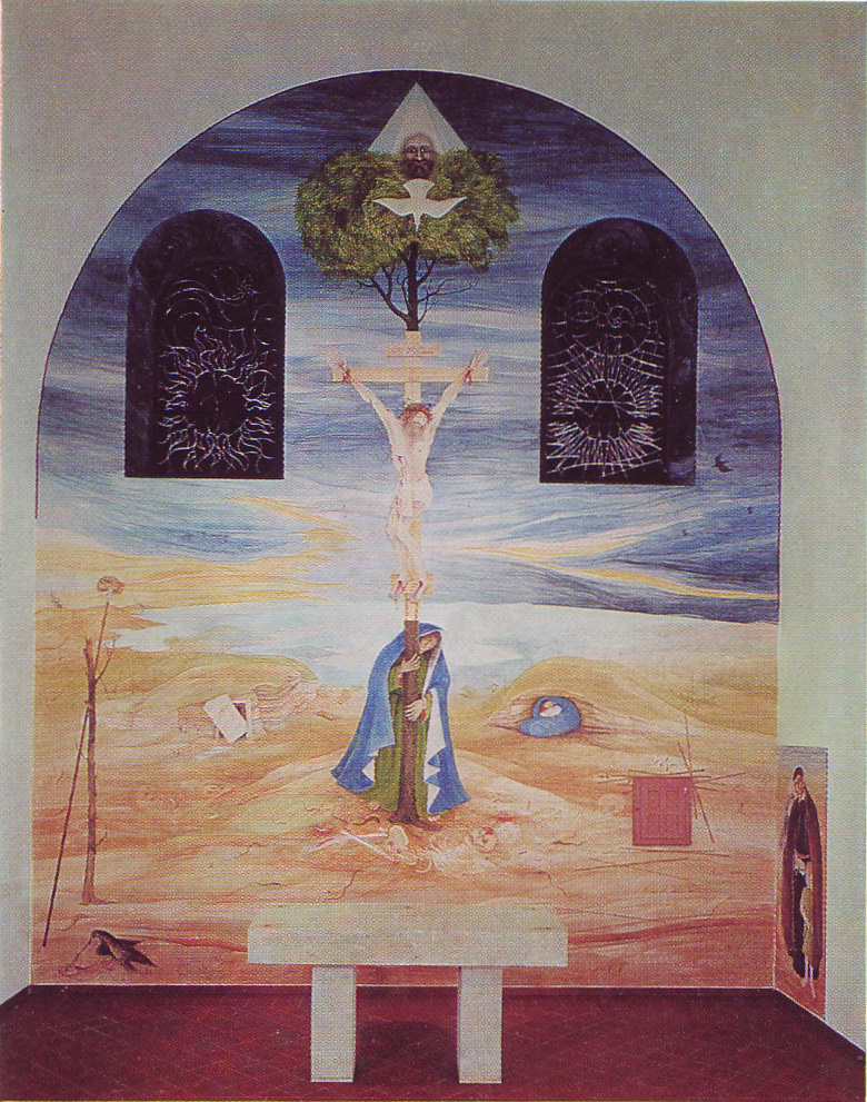 Mural painting, Crucifixion, Vincent de Paul and child at right; original in community chapel, Vienna (Kaiserstrasse)