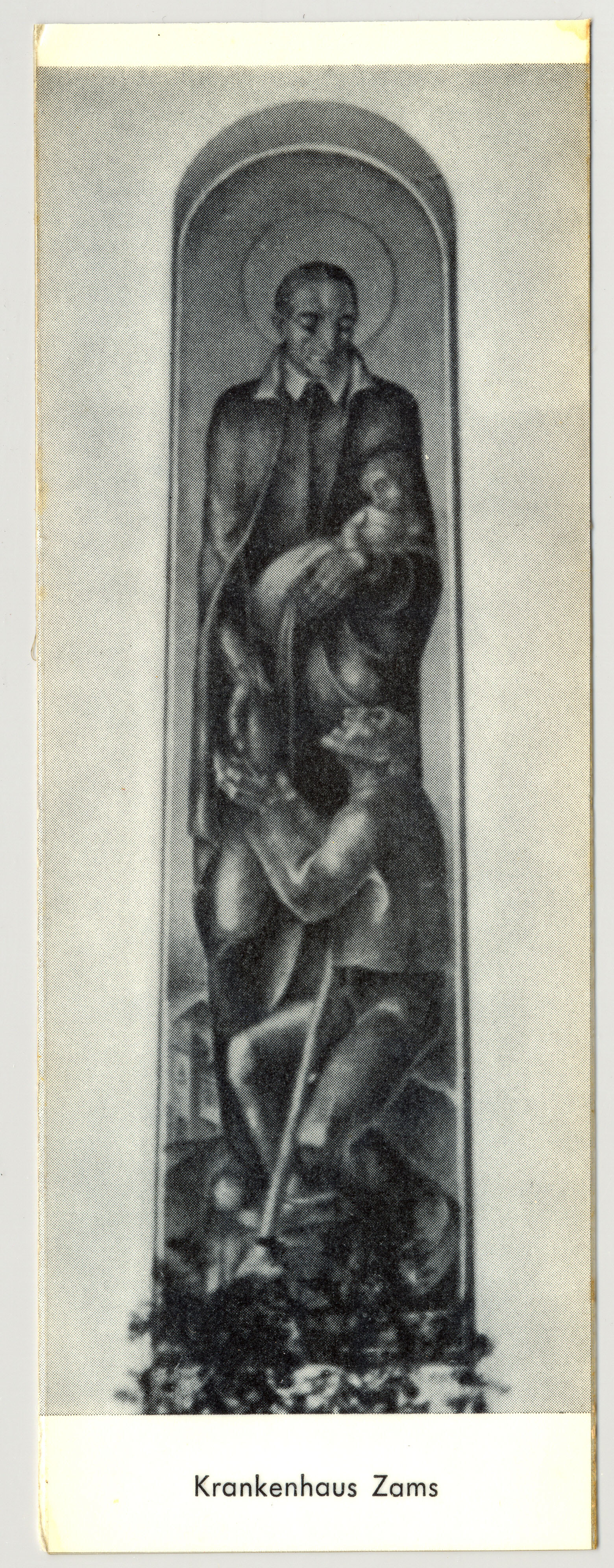 Black and white photo, Vincent de Paul, standing, cassock, cape, skullcap, halo; giving alms to a crippled man; holding child in his arms; original at hospital in Zams