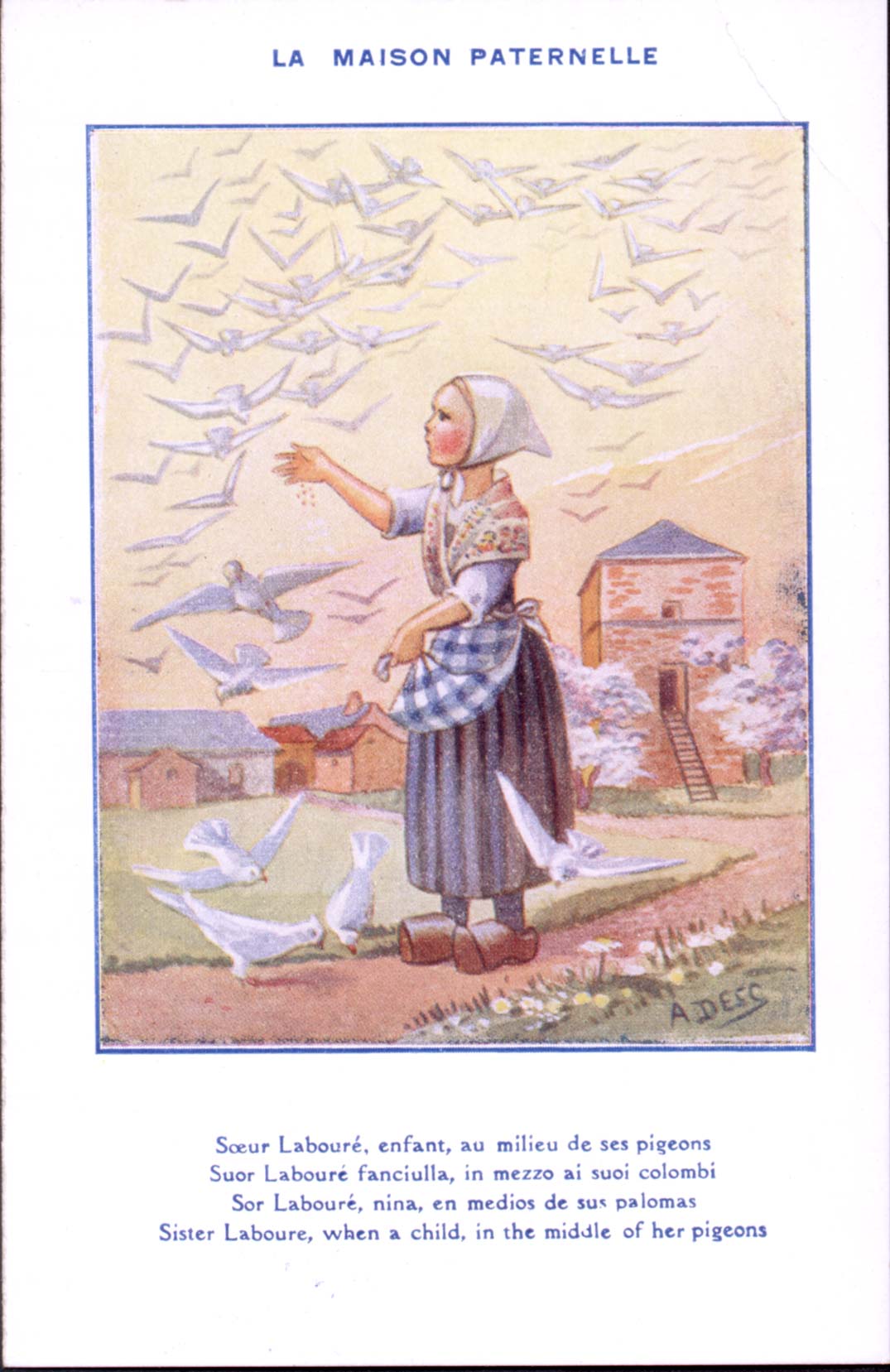 Catherine enfant soignant les pigeons de la ferme, Aquarelle de A. DESC,