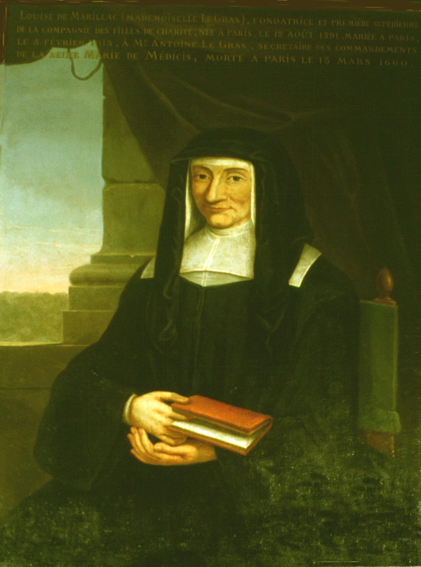 Text: founder, first superior, birth details, married to Antoine Le Gras (secretary of Marie de Medici), death details