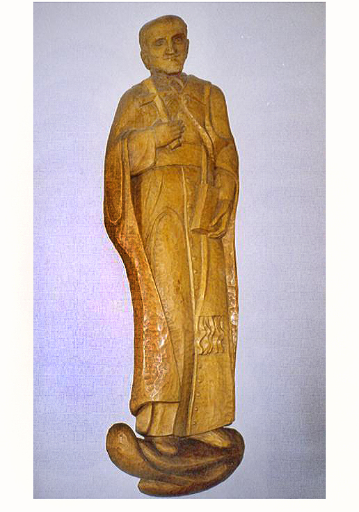 Wooden statue of Vincent de Paul, standing, in cassock and cape, holding cross and book. Original in Vincentian mother house, Graz