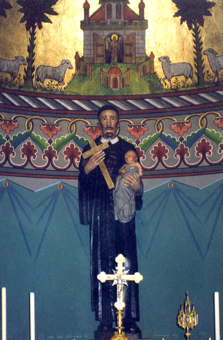Painted statue; Vincent de Paul, standing, cassock, short cape, skullcap, holding child and cross; original in motherhouse of Sisters of Charity, Innsbruck