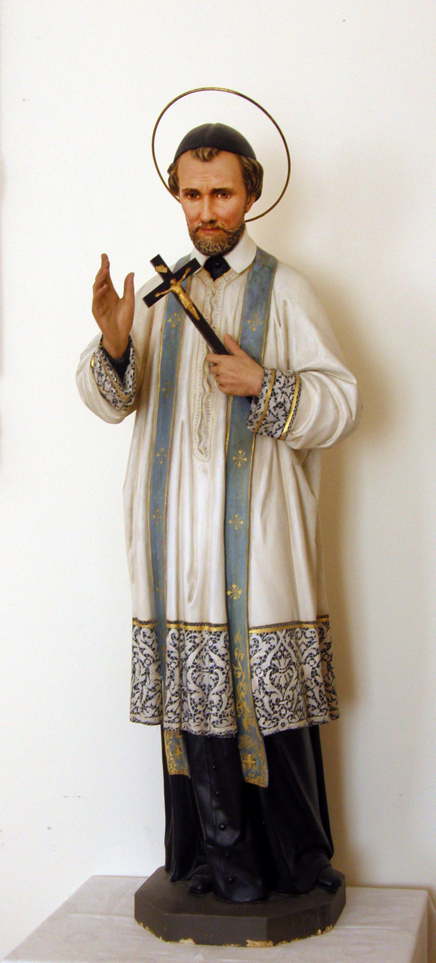 Wood statue; Vincent de Paul standing, cassock, surplice, blue stole, skullcap, halo; holding crucifix; in CM parish house, Kaiserstrasse, Vienna.
