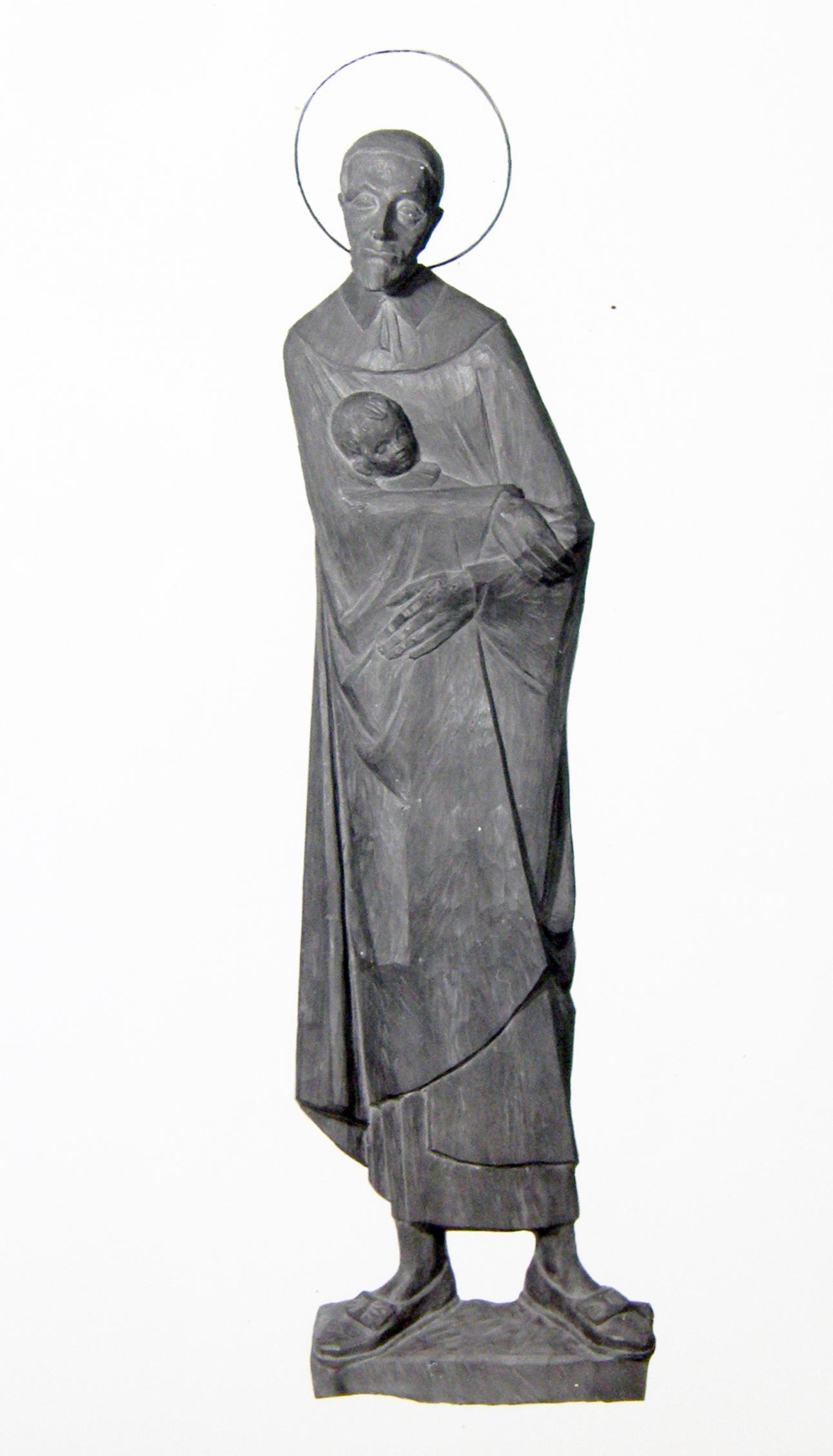 Vincent de Paul, standing, cassock, cloak, skullcap, halo; holding child. Original wooden statue in mother house of Sisters of Charity, Zams, Austria