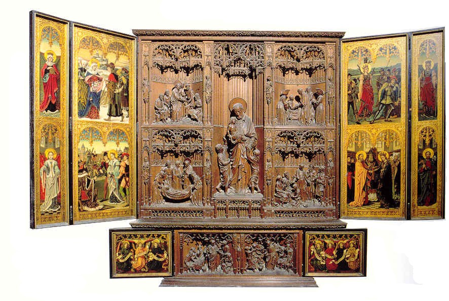 Carved and painted wooden altar piece, polyptych; Vincent de Paul and others in works of charity; original, 19th century, in cathedral, Antwerp