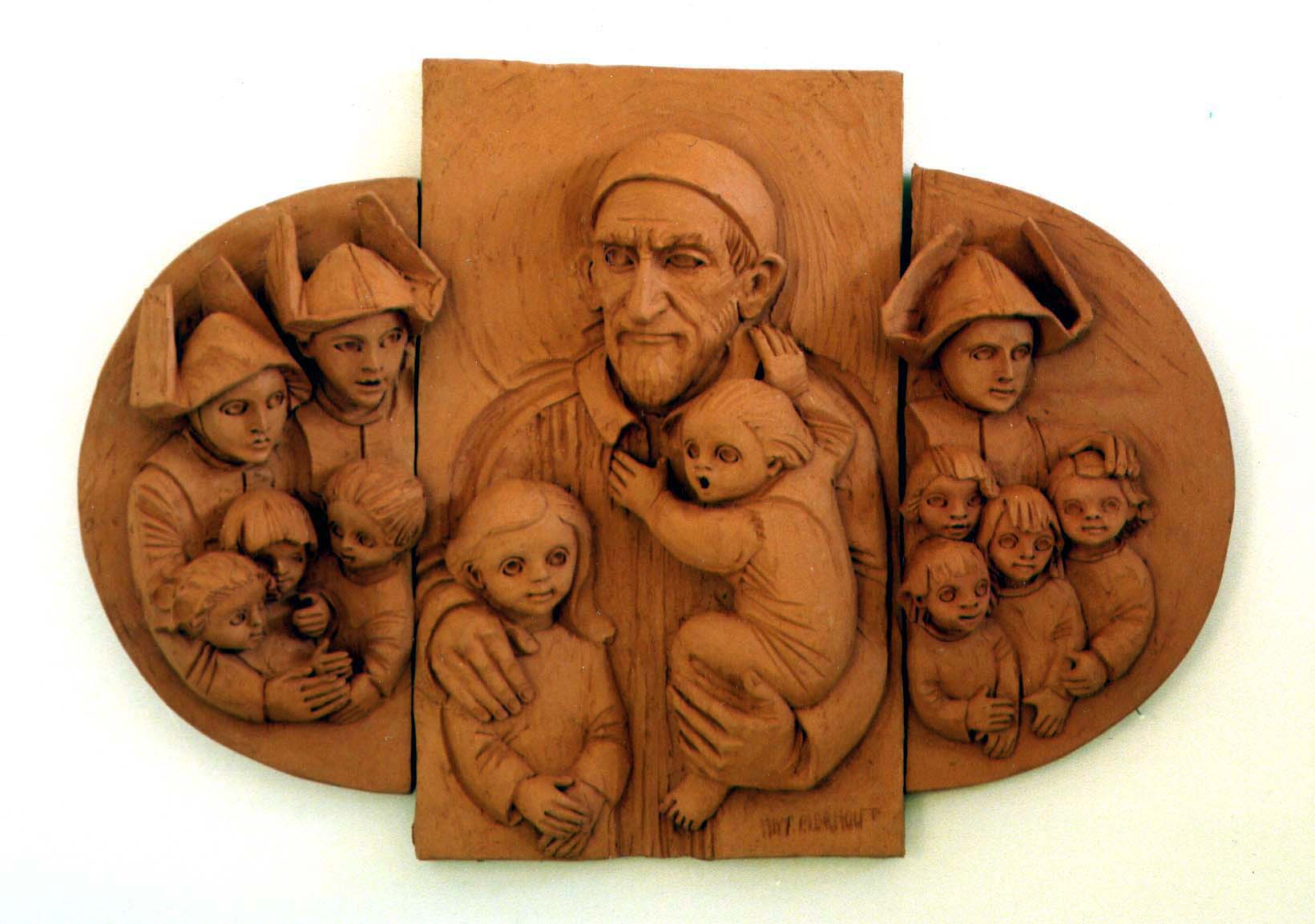 Carved bas relief, Vincent de Paul with two children, three Daughters of Charity, seven other children; location of original in Gijzeghem unknown