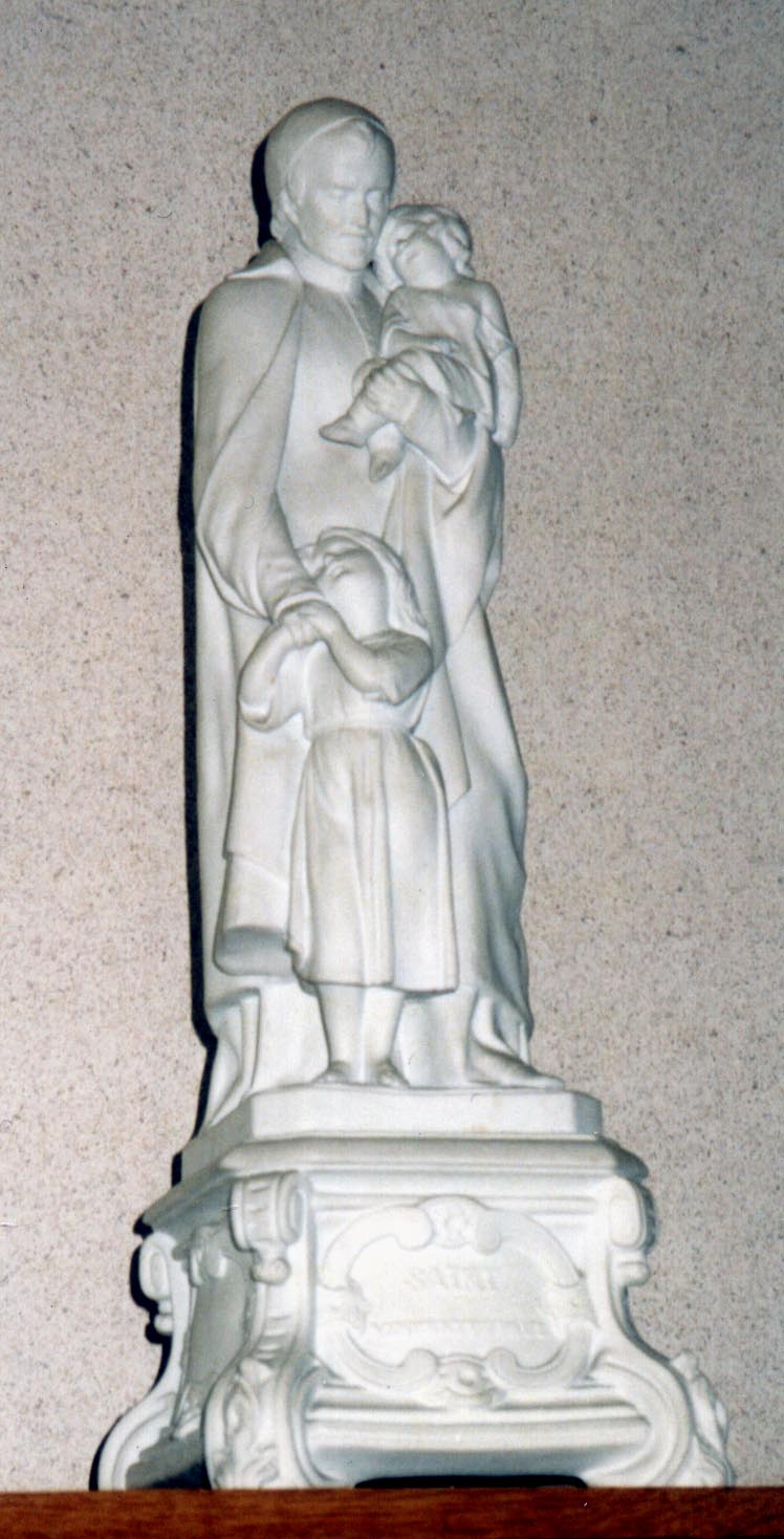 White porcelain statue and base, Vincent de Paul standing with two children; original in Vincentian house, Louvain