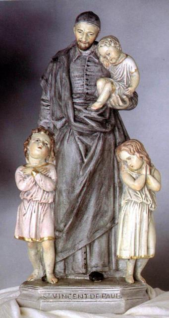 Painted plaster (?); Vincent de Paul, standing, cassock, mantle, skullcap, with three children; location of original unknown