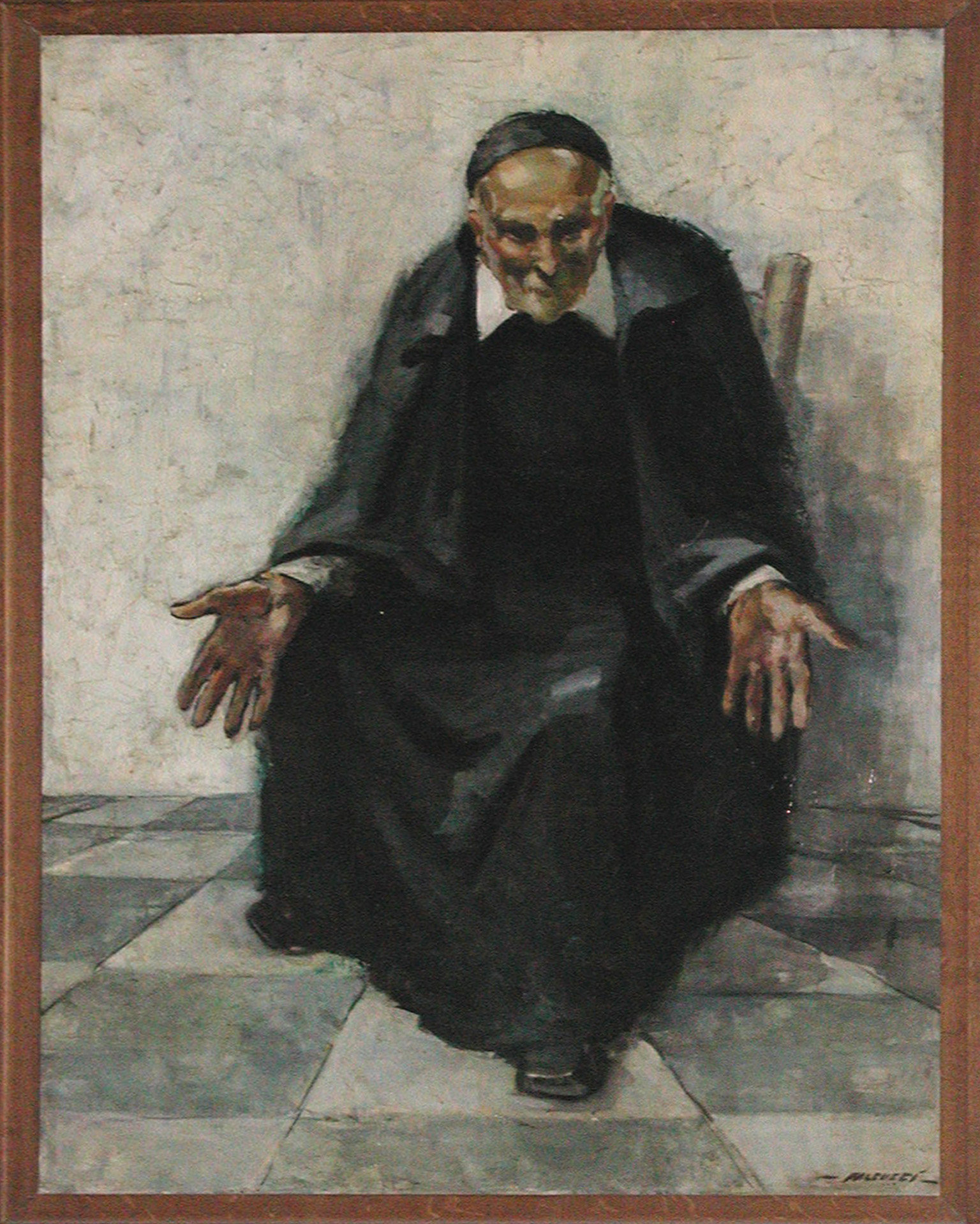 Oil on canvas, Vincent de Paul, seated, casssock, mantle, skullcap; large and prominent hands; work of Robert Falucci (1900-1989); original in parish church of Clichy