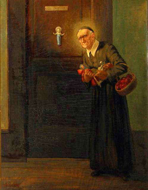 Oil on canvas, 1925; Vincent de Paul, standing, in cassock, skullcap; holding toys, basket of apples; image of infant Jesus (foundling symbol); artist: McAleer; in Miraculous Medal Assn. museum, Germantown, PA