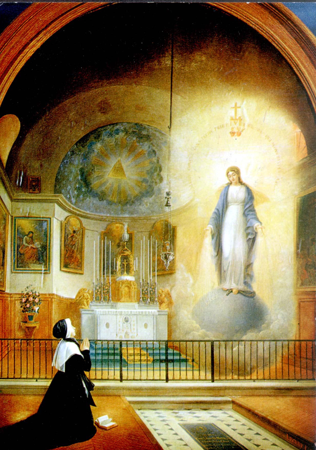 Catherine LABOURƒ, vision de la Vierge aux rayons, 27/09/1830, 140 rue du Bac, PARIS, Toile de LECERF, 1835. L'un des premiers tableaux des apparitions de Marie ˆ Catherine LabourŽ en 1830.
