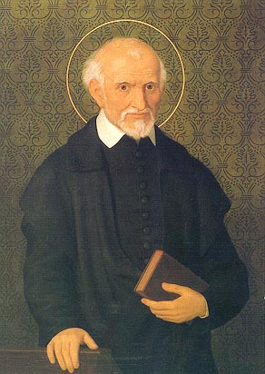 Oil painting, gilded background; Vincent de Paul, cassock and mantle, holding book, probably Rules; location of German original unknown
