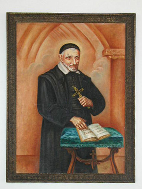 Framed oil painting; Vincent de Paul, cassock, mantle, skullcap, holding preaching crucifix, gesturs to common rules on blue upholstered prie-Dieu; original in Vincentian house, Funza