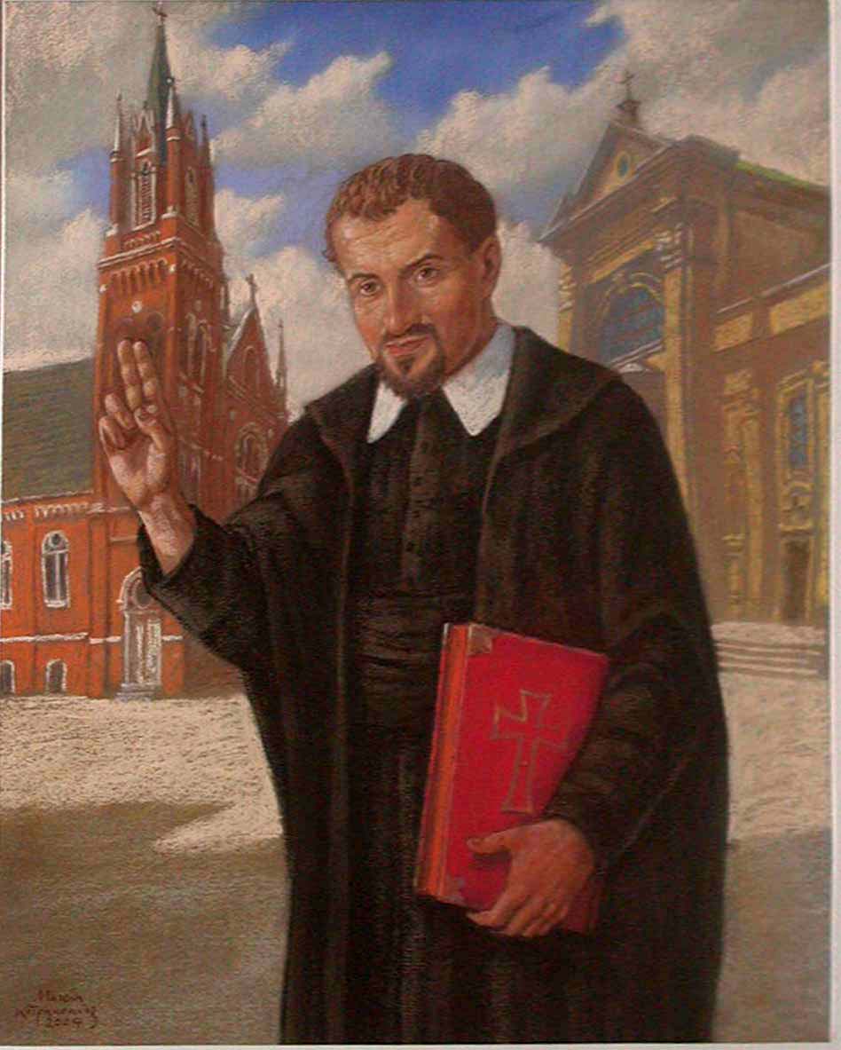 Oil painting for 2004 anniversary of Polish mission; young Vincent de Paul, cassock, mantle, holding book, hand raised in blessing; Holy Cross, Warsaw, and US church in background; original in West Hartford
