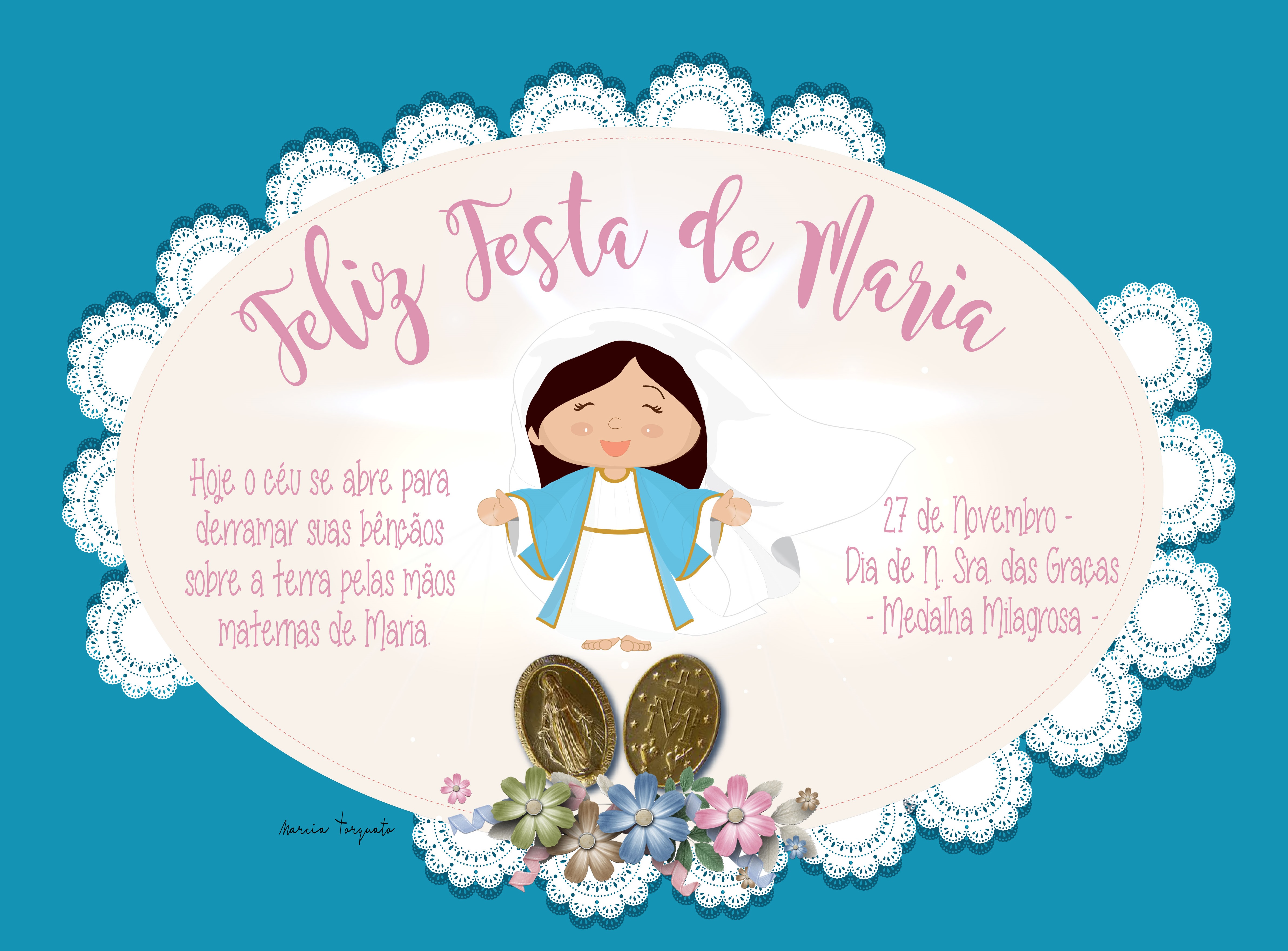 Text: Happy feast of Mary. Today heaven opens to pour out its blessings on the earth through the material hands of Mary. 27 November, the day of Our Lady of Graces, the Miraculous Medal