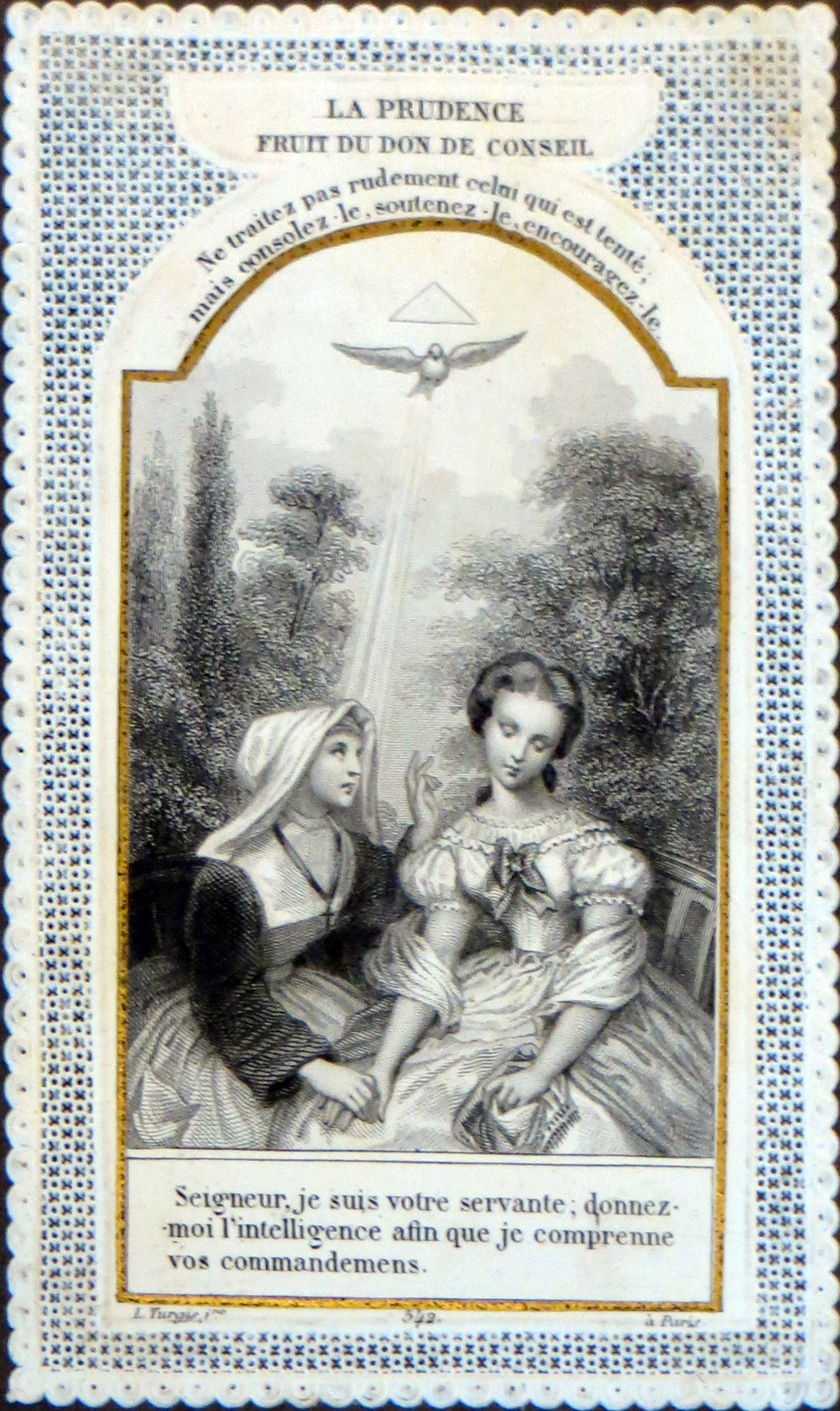 Text: Prudence, the fruit of the gift of counsel. [Below] Lord, I am your handmaid; give me knowledge that I might understand your commandments. French, embossed Archives, Sisters of Charity of Munich