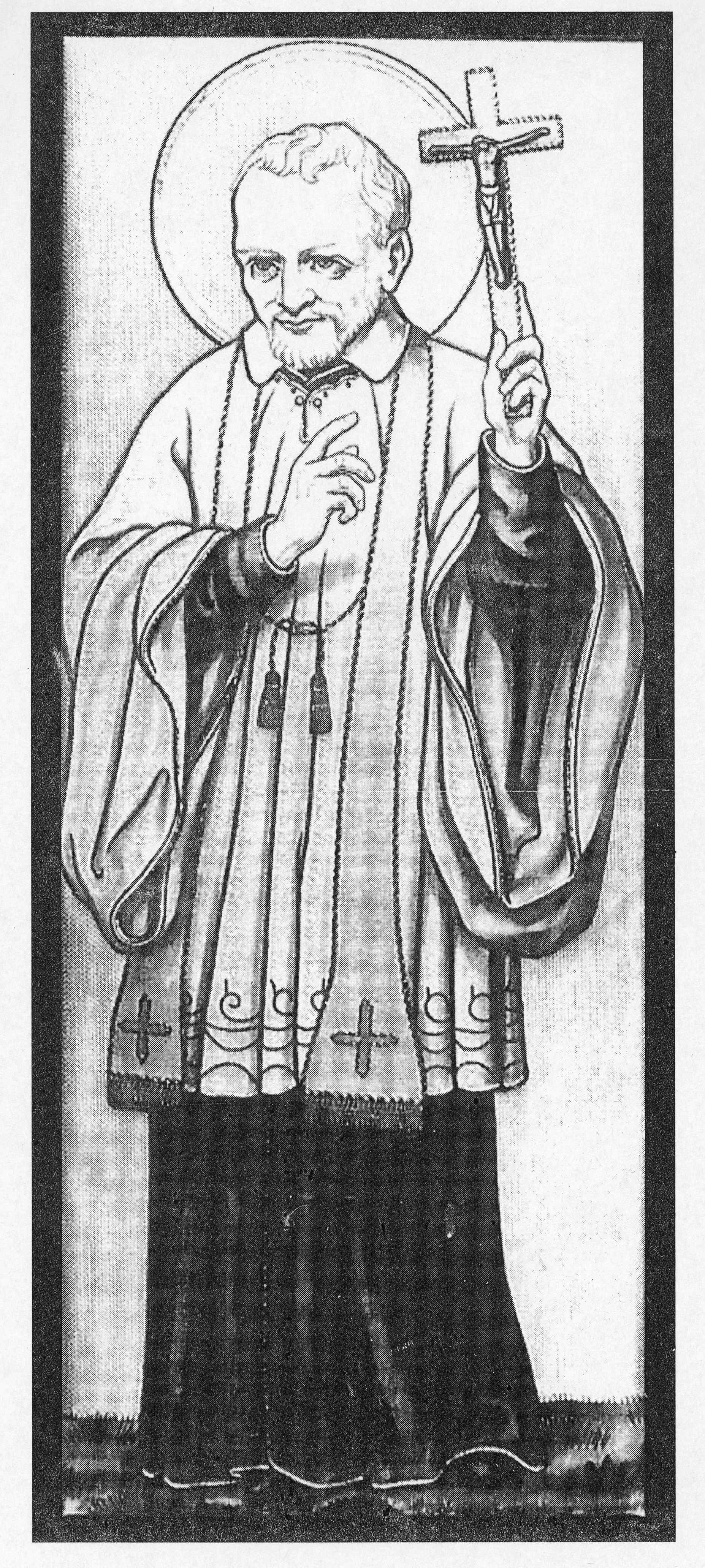 Vincent de Paul, standing, cassock, surplice, stole, halo; holding cross and pointing to it with his other hand. From Recife (Pernambuco), Brazil