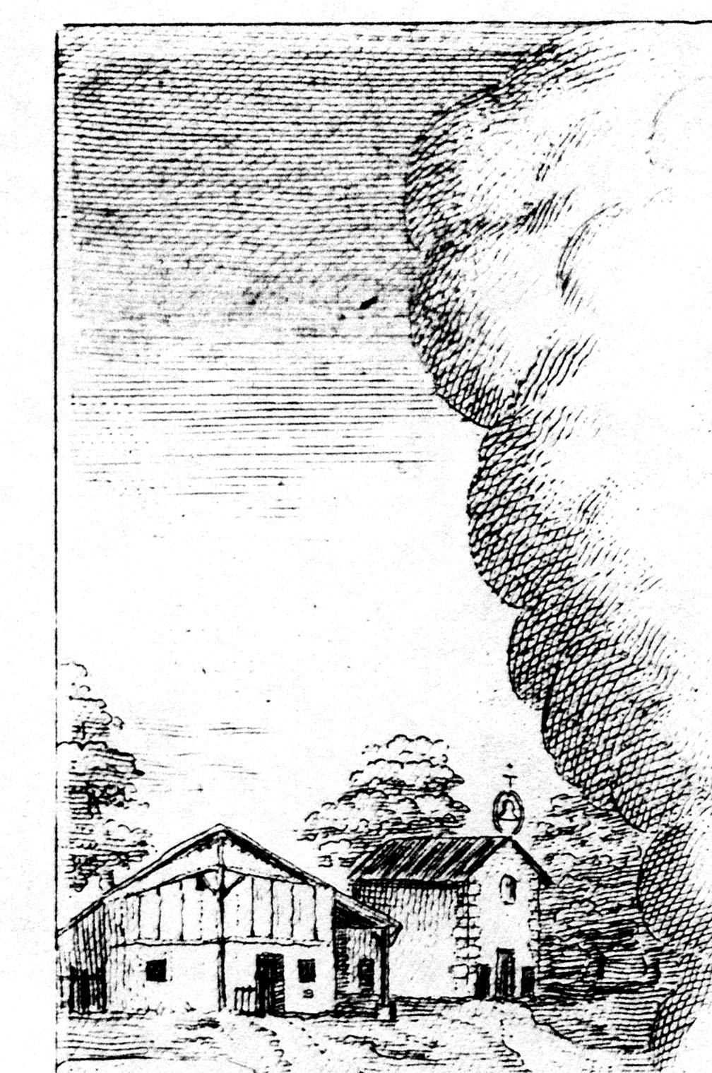 Depicts house, Ranquines, facing the street, with sloping roof covering stable on right; original chapel. This is the only known depiction of the original chapel; dimensions: 14ft (4.62m) wide; 20ft (6.6m) long; 10ft (3.3m) high; tile roof; outer area: 280 sq. ft. (31 sq. m)