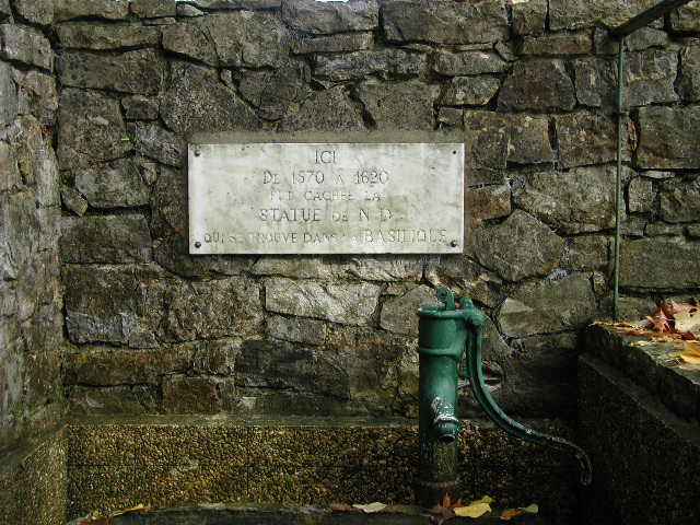Text: Here from 1570 to 1620 was hidden the statue of Our Lady, now found in the basilica