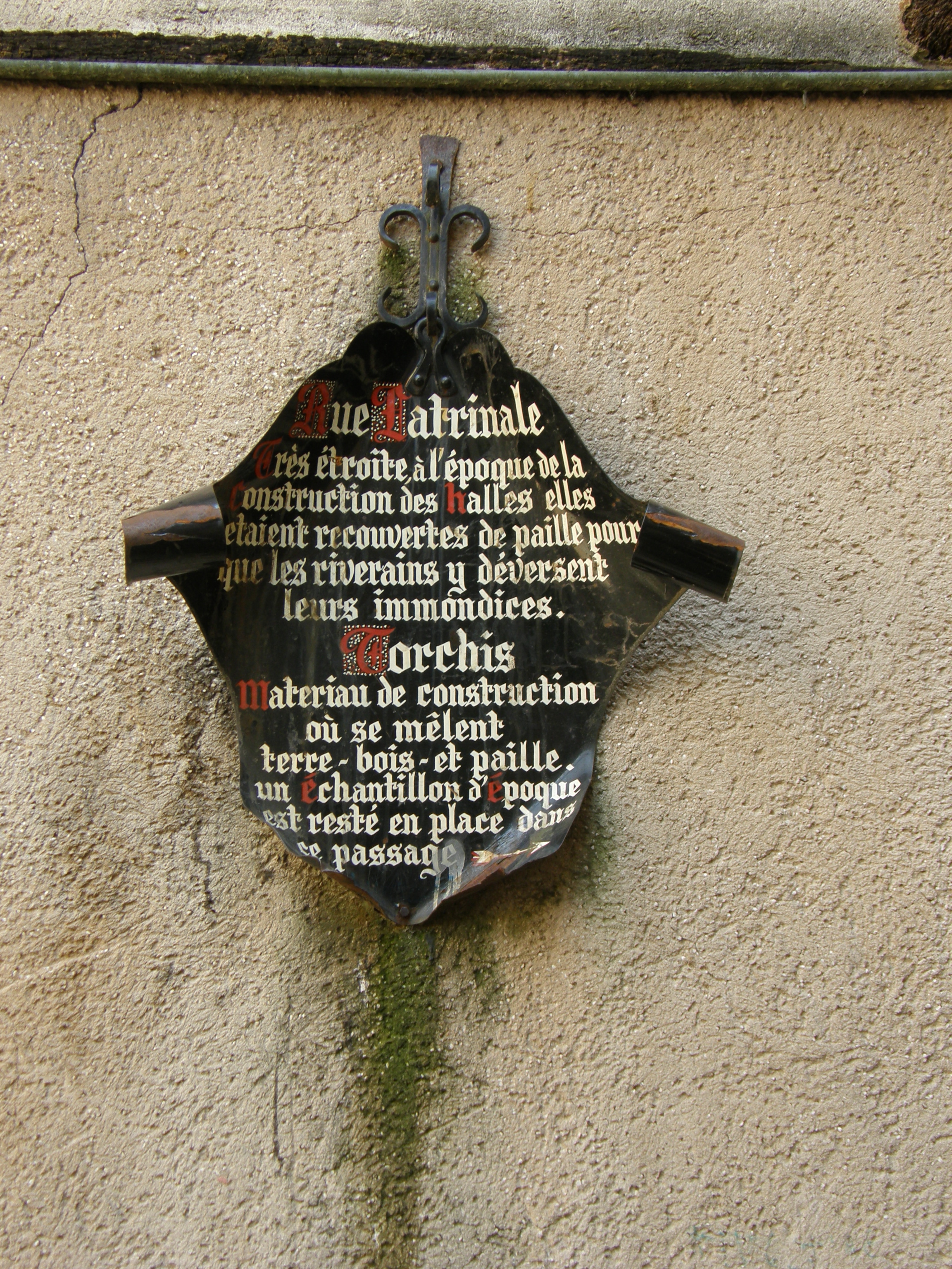 Text: Rue Latrinale, very narrow at the building of the market; covered with straw for the inhabitants to pour out their waste. "Torchis," buildilng material, mixture of earth, wood, and straw. A contemporary sample visible in the passageway