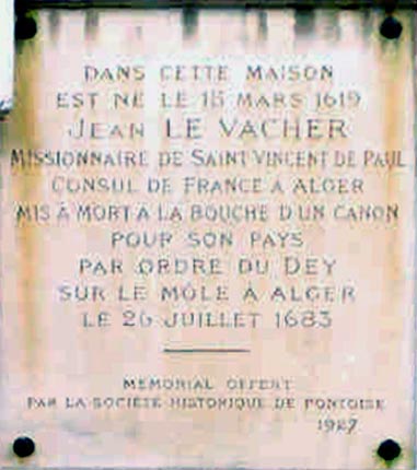 Text: In this house there was born, 15 March 1619, Jean Le Vacher, Missioner of SVdP, consul of France in Algiers. Executed at the mouth of a cannon for his country by order of the Dey, on the pier at Algiers, 26 July 1683.