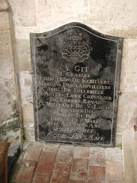 Text: Here lies M. Charles Thimoleon de Sericourt, marquis of Esclainvilliers, lord of Folleville and other places, knight of the royal military order of St. Louis, brigadier of the king's arms; died 17 March 1751, age 69. Pray God for his soul