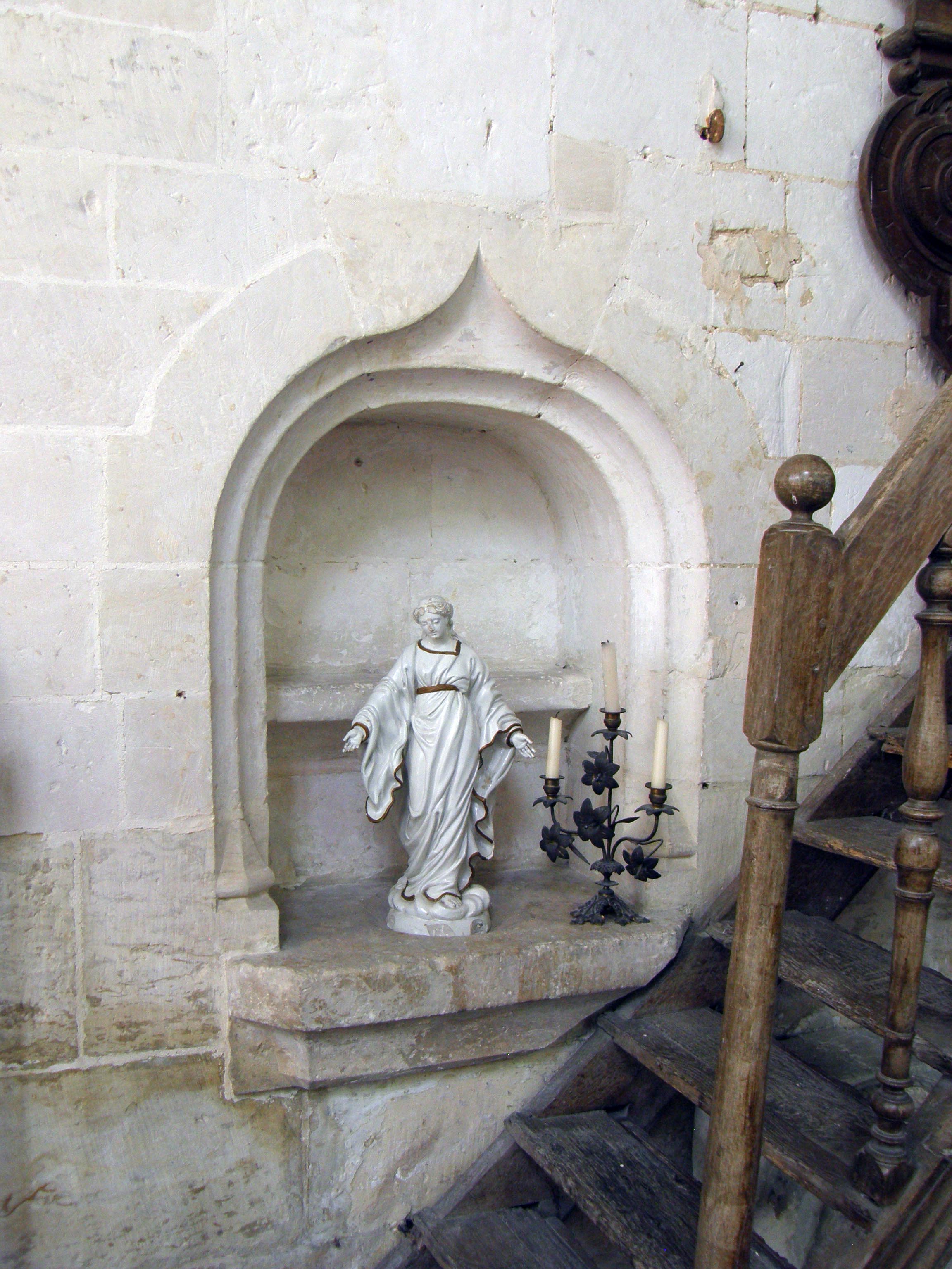 Piscine: for holding liturgical objects next to side altar, now removed and replaced by pulpit; with Bourchardon statue of Mary