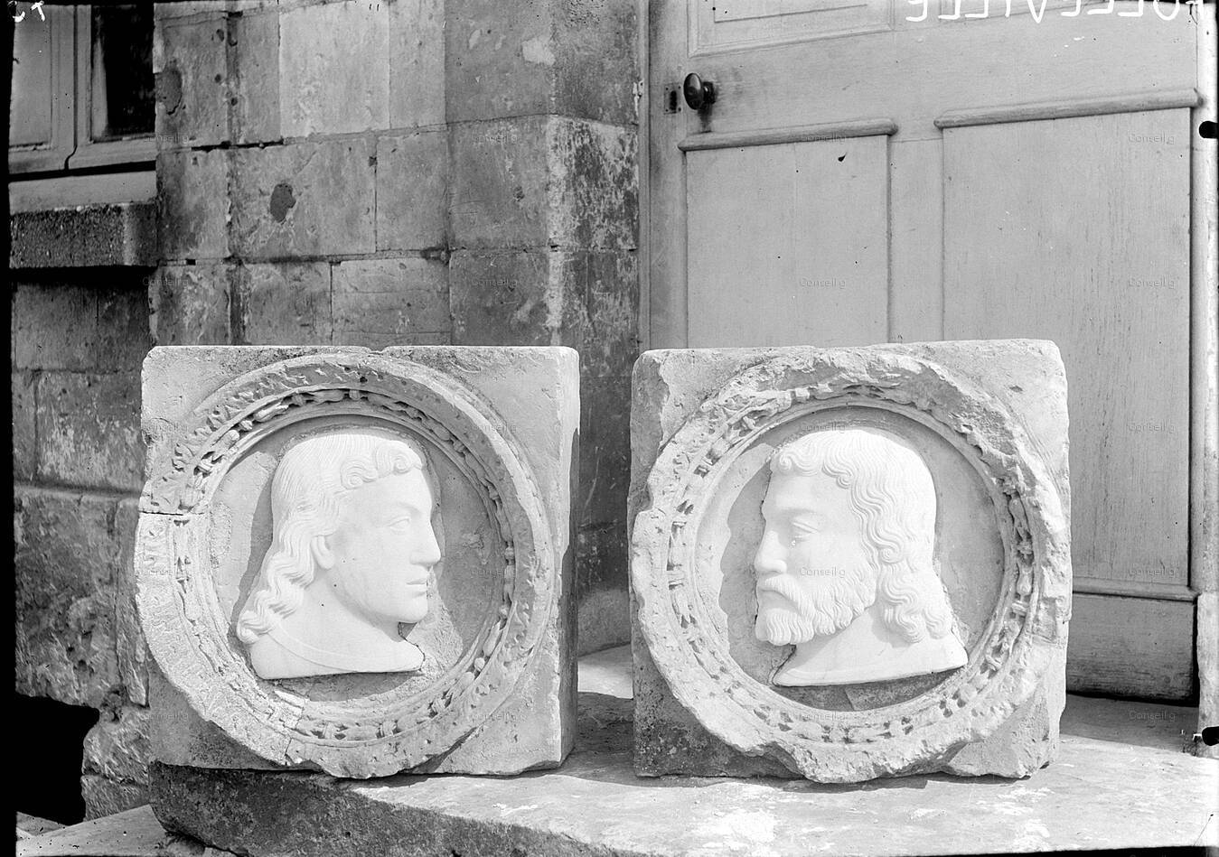 Heads of two family members, removed from original placement; displayed under pulpit