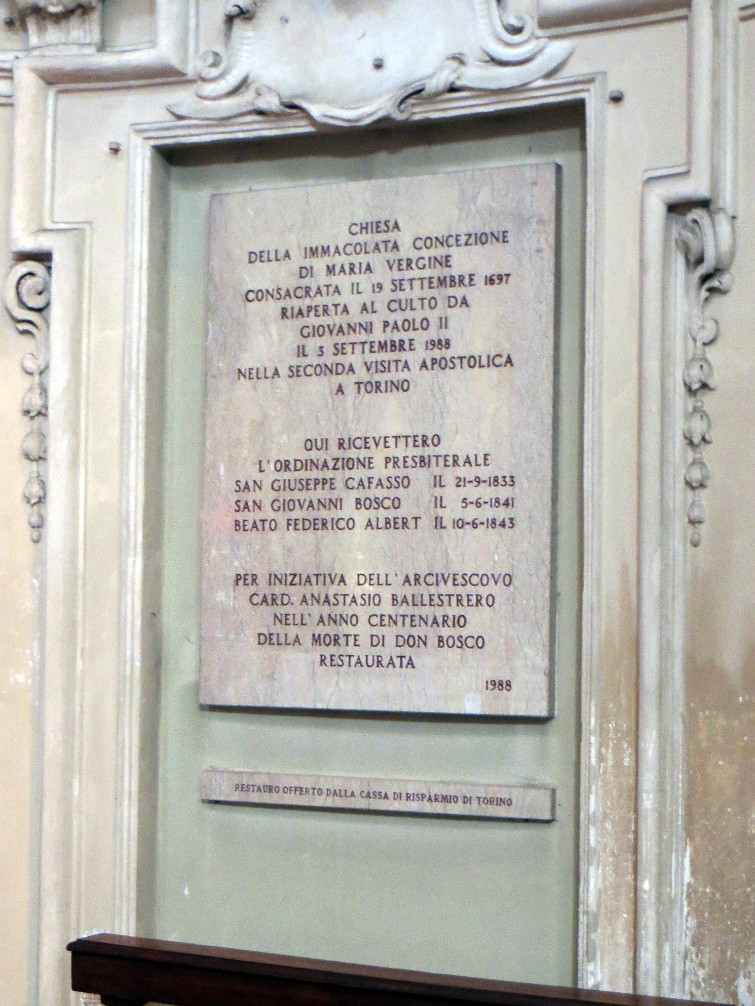 Church restored and reopened 1988; Don Bosco ordained here, 1841, and two other saints.