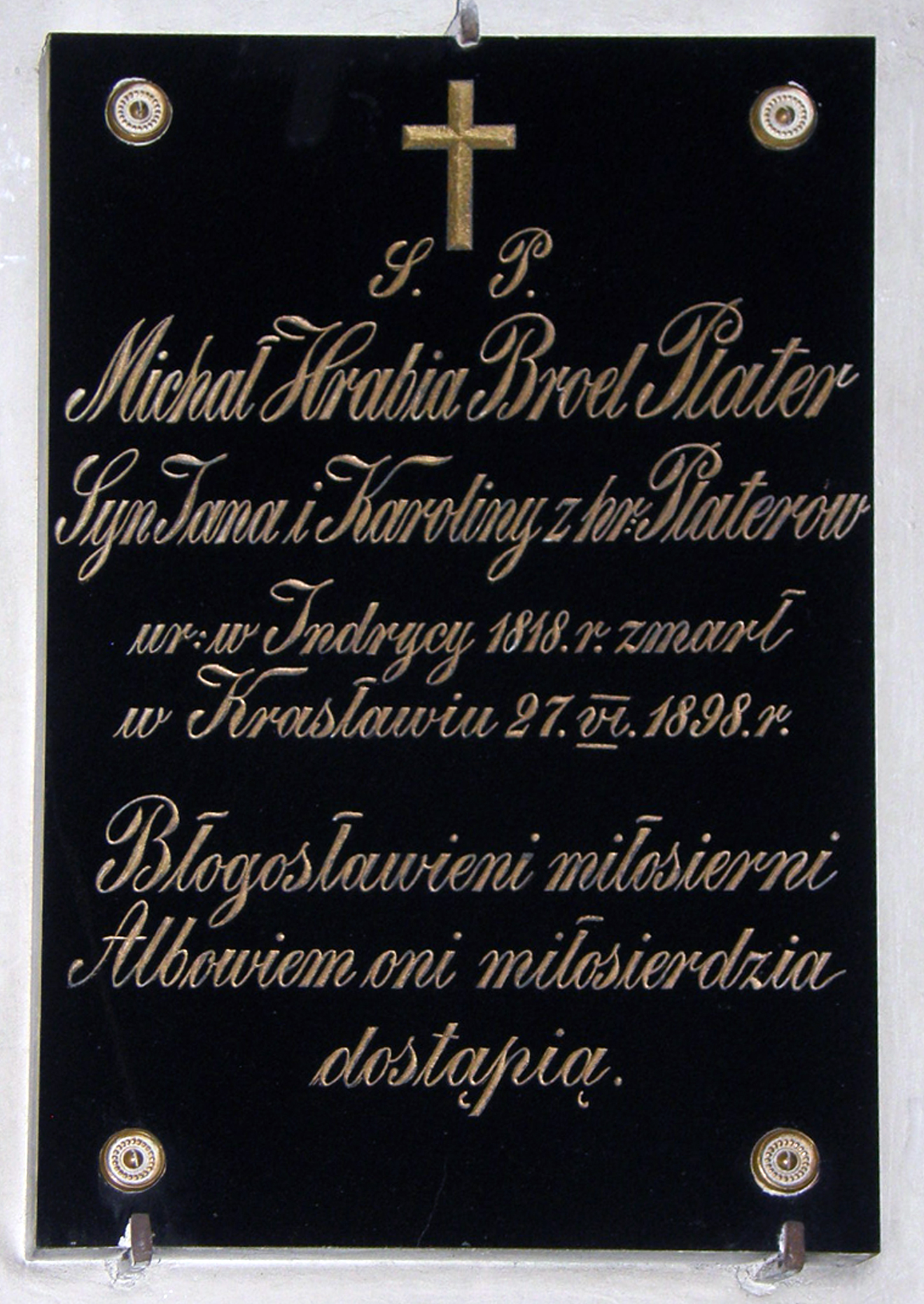 Polish text: Michael Hrabia Broel Plater, son of Jan and Karolina of the counts of Plater, born in Indrycz in 1818, died in Kraslawa, 27-June-1898. "Blessed are the merciful; they shall receive mercy."