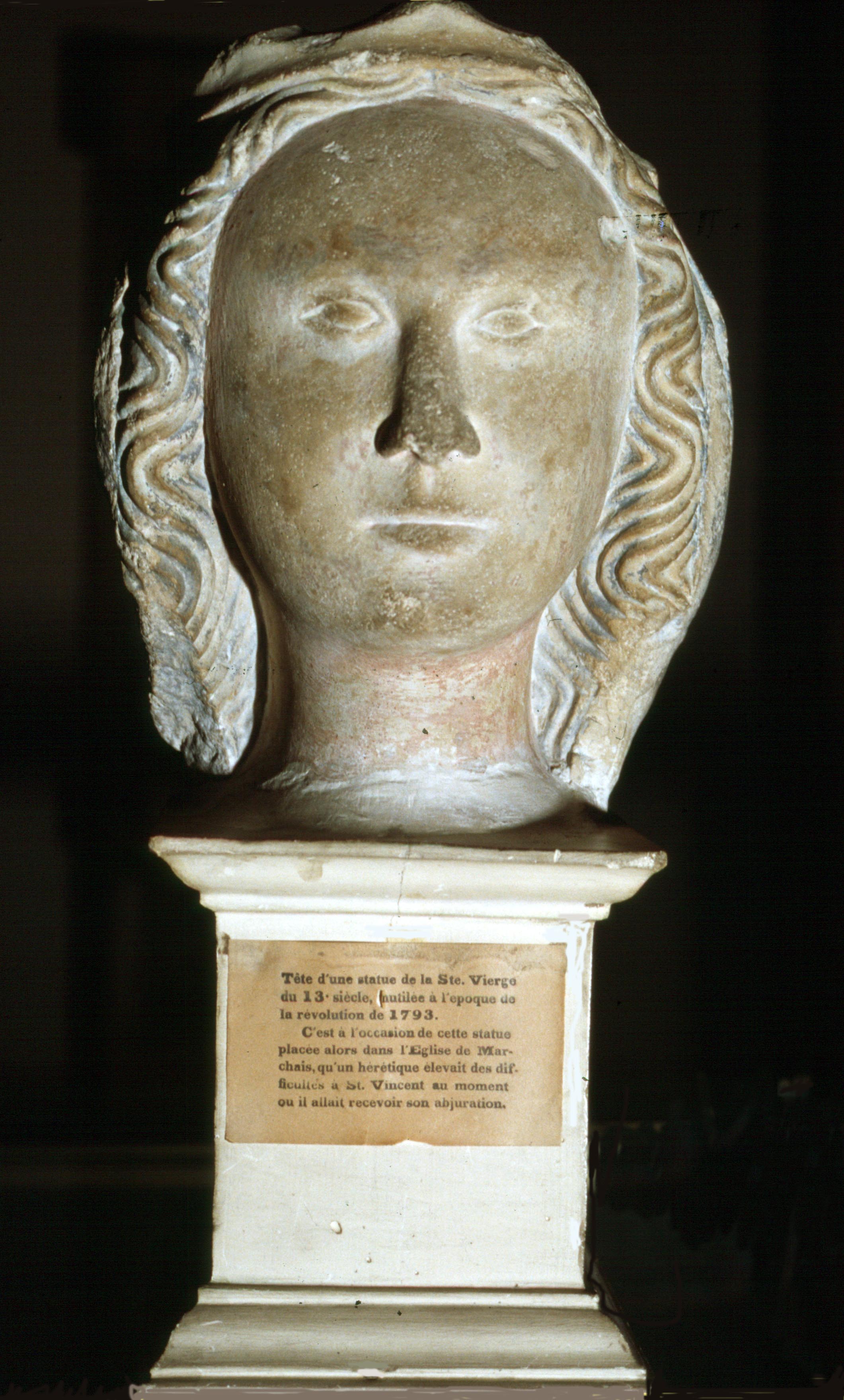 Tte d'une statue de la Vierge du 14e sicle de l'Žglise de Marchais. SacagŽe durant la RŽvolution en 1793, on ne retrouva que ce fragment.