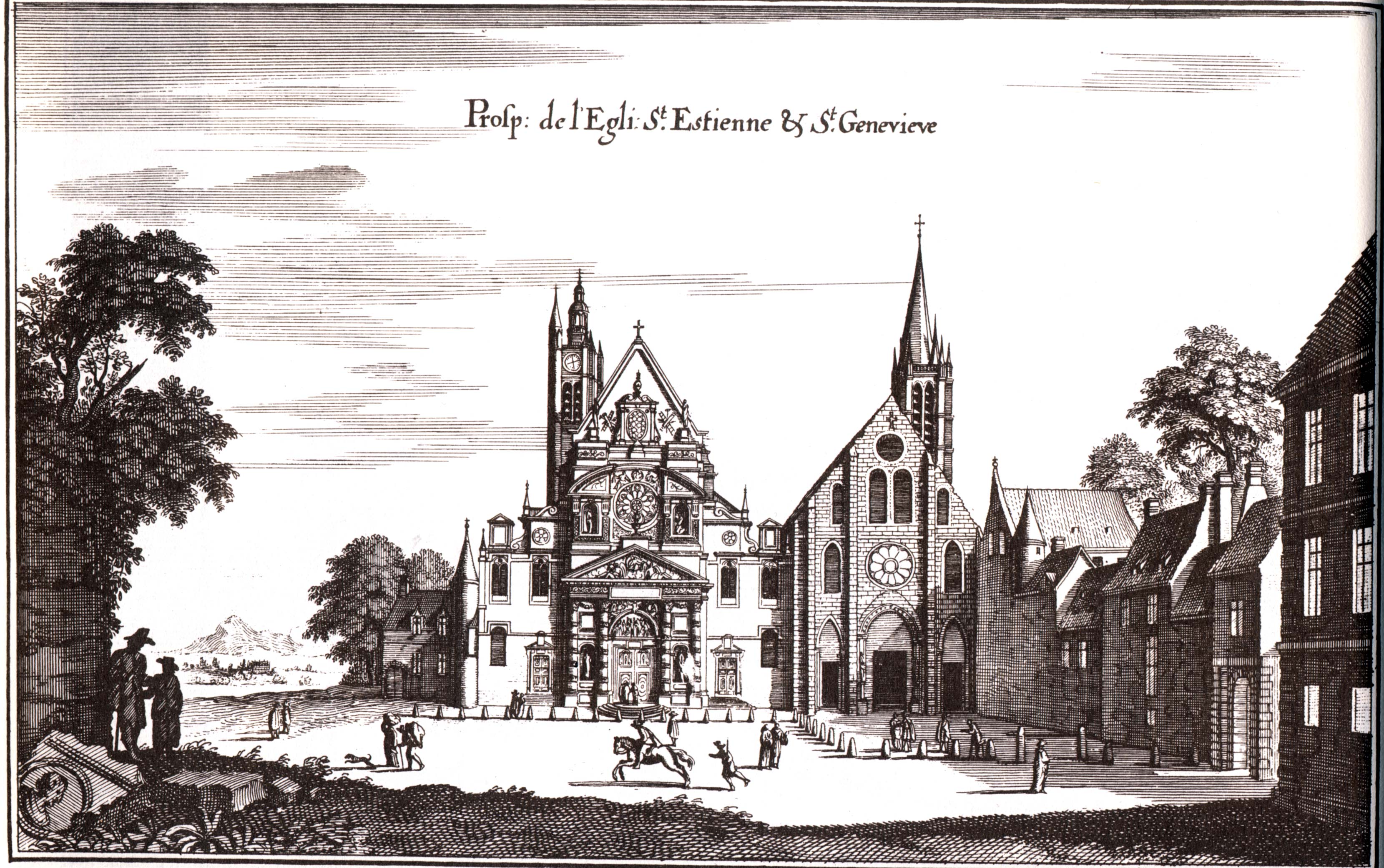 Paris : Žglises St-ƒtienne-du-Mont (ˆ gauche) et Ste-Genevive (ˆ droite - actuellement dŽtruite sauf la tour) au sommet de la "Montagne Ste-Genevive".