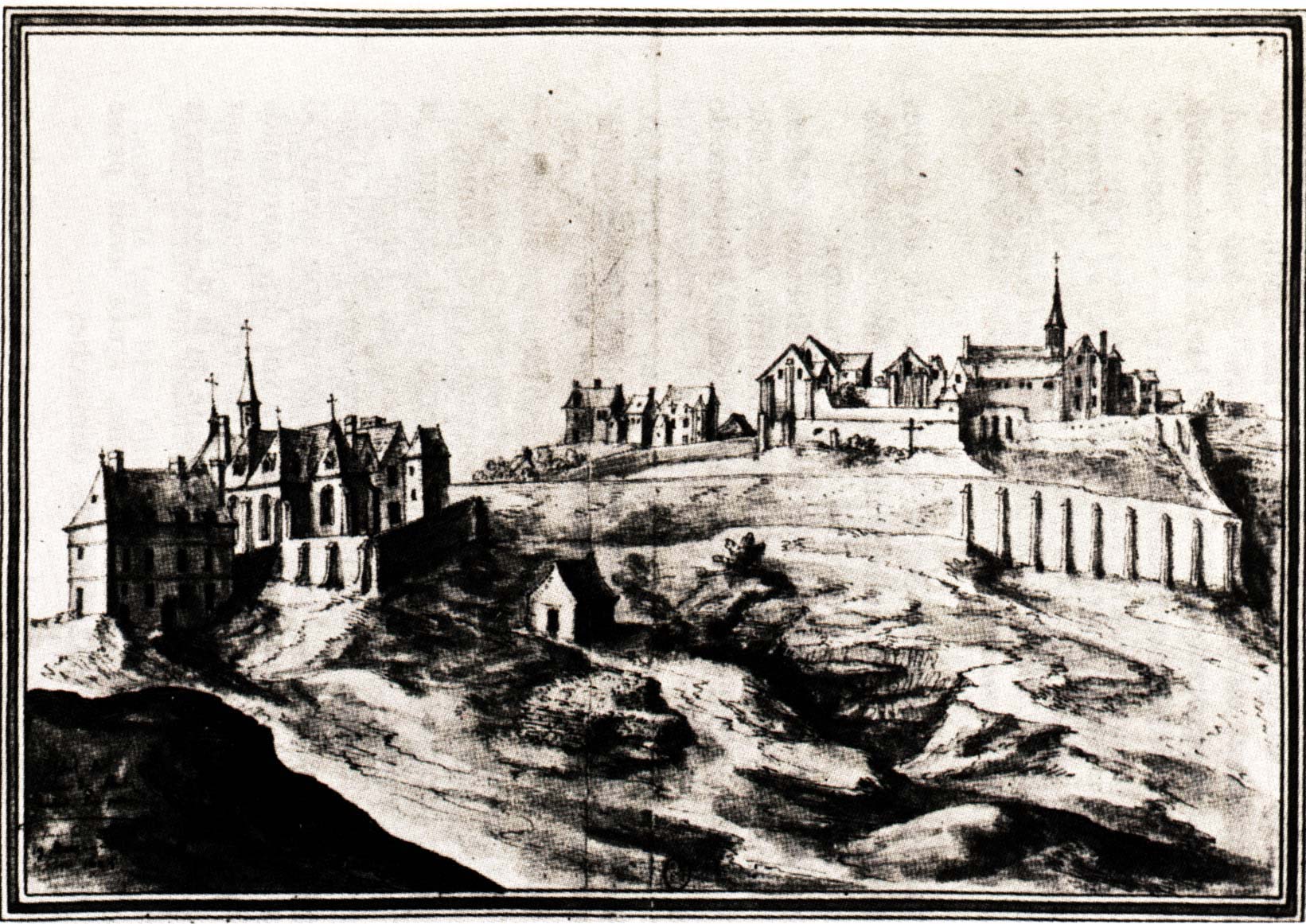 La butte MONTMARTRE dessinŽe en 1925 par Martellande sj. En haut, l'antique Abbaye, Ë mi-c™te, le prieurŽ et l'Žglise du "Martyrium" Gravure B.N. in Paul MILCENT, Vie de St Jean EUDES, PARIS CERF, Paris 1985, 468.