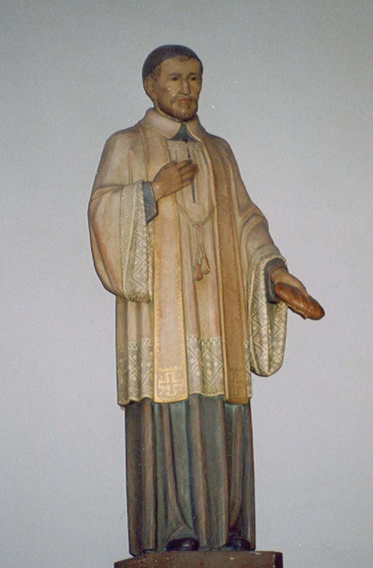 Carved wooden statue, Vincent de Paul in cassock, surplice, stole, loaf of bread in his hand. Original in Vincentian house, Montebello