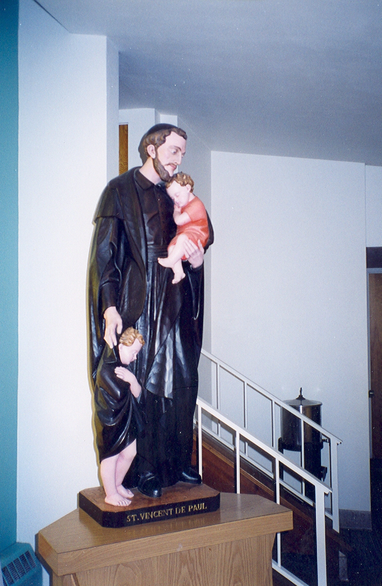 Statue, painted, Vincent de Paul with two children; name below. Original in St. Vincent de Paul parish, San Diego.