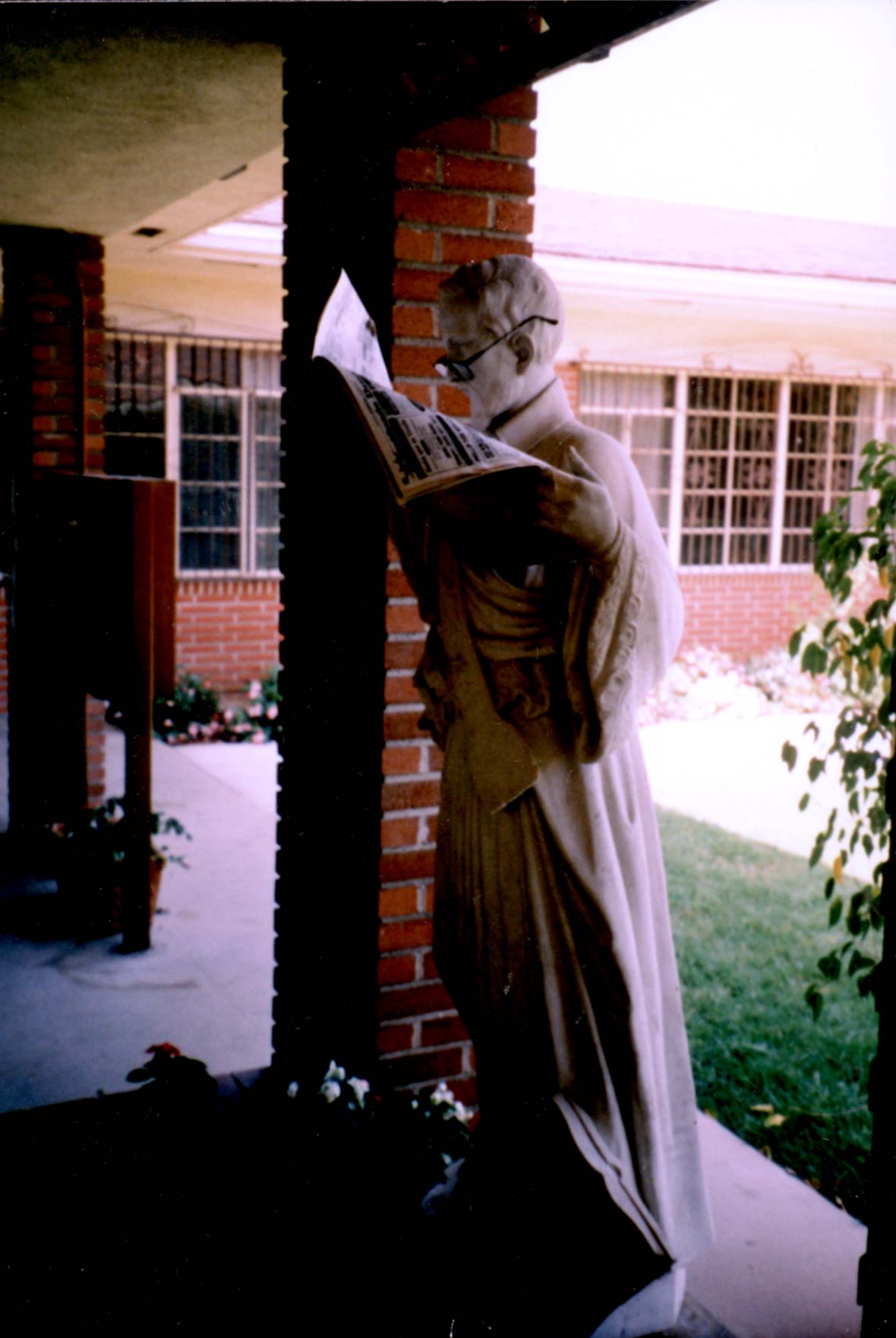 Marble, Vincent de Paul, Bracci model, arranged as a temporary joke with glasses, newspaper; statue at Vincent de Paul center, Montebello, CA