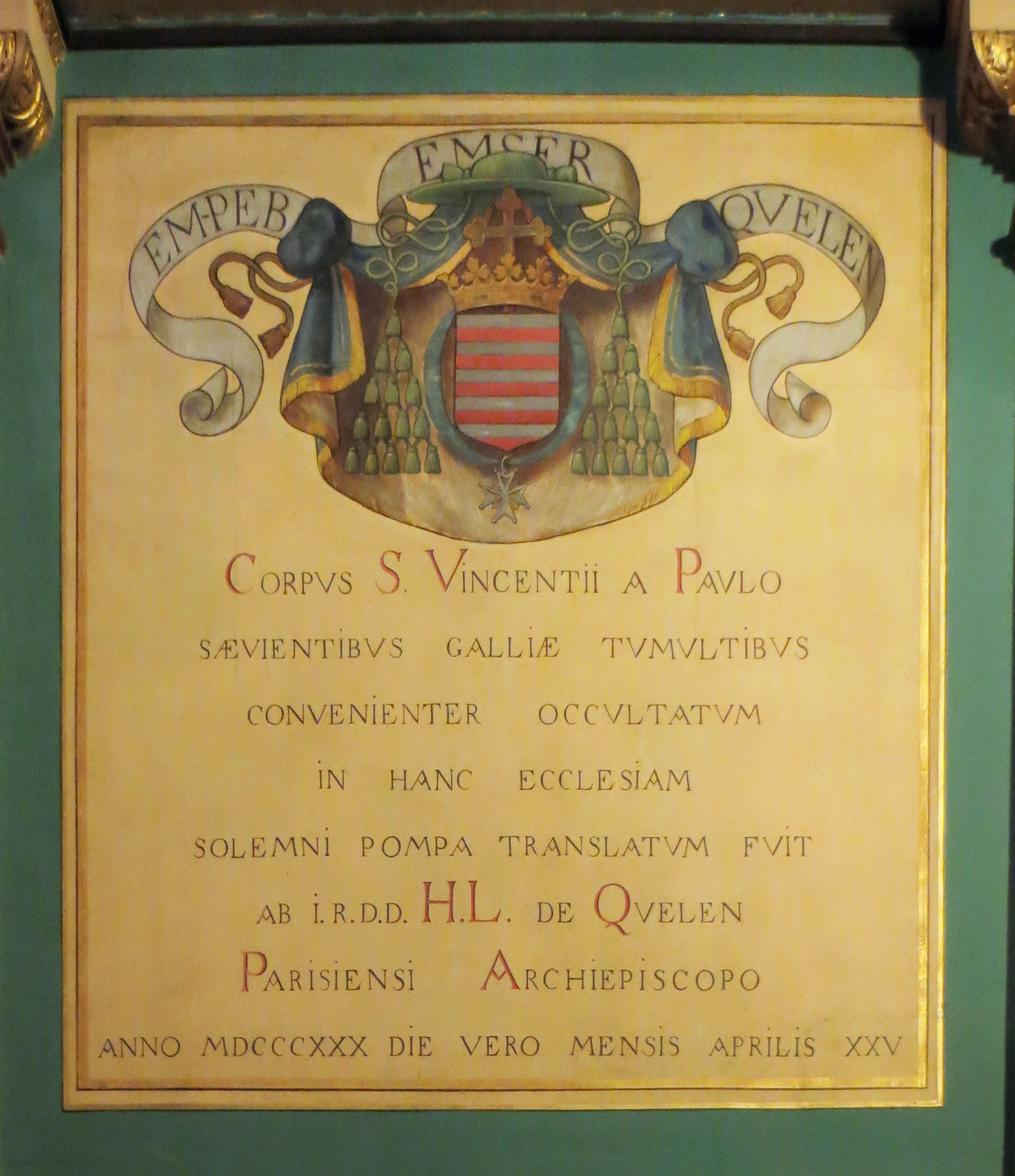 Text: The body of SVdP, hidden during the French Revolution, was transferred to this church with solemn ceremonies by ... H. L. de Quelen, archbishop of Paris, 25 April 1830