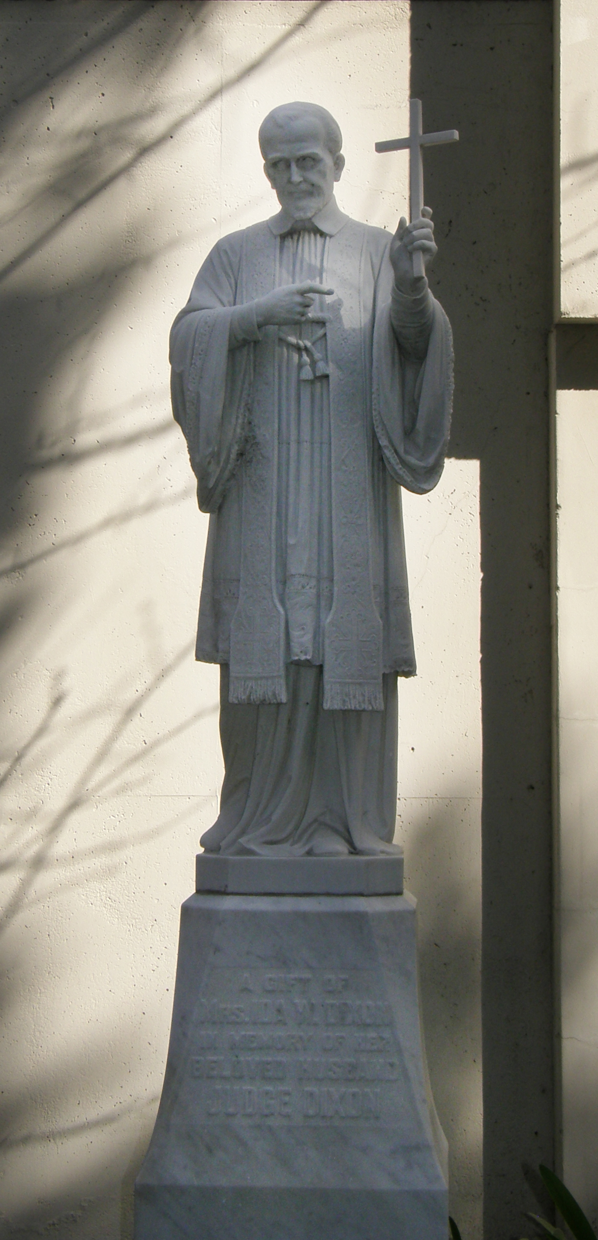 Marble statue; Vincent de Paul, standing, cassock, surplice, stole, skullcap, gesturing to crucifix; commemorative text: A give of Mrs. Ida M. Dixon in memory of her beloved husband Judge Dixon.