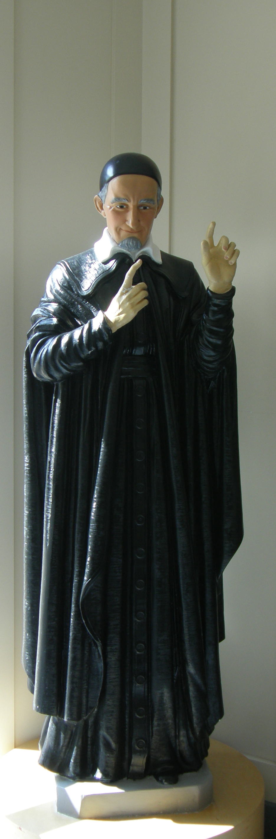 Painted statue, Vincent de Paul, standing, cassock, cincture, mantle, skullcap; gesturing to (missing) crucifix