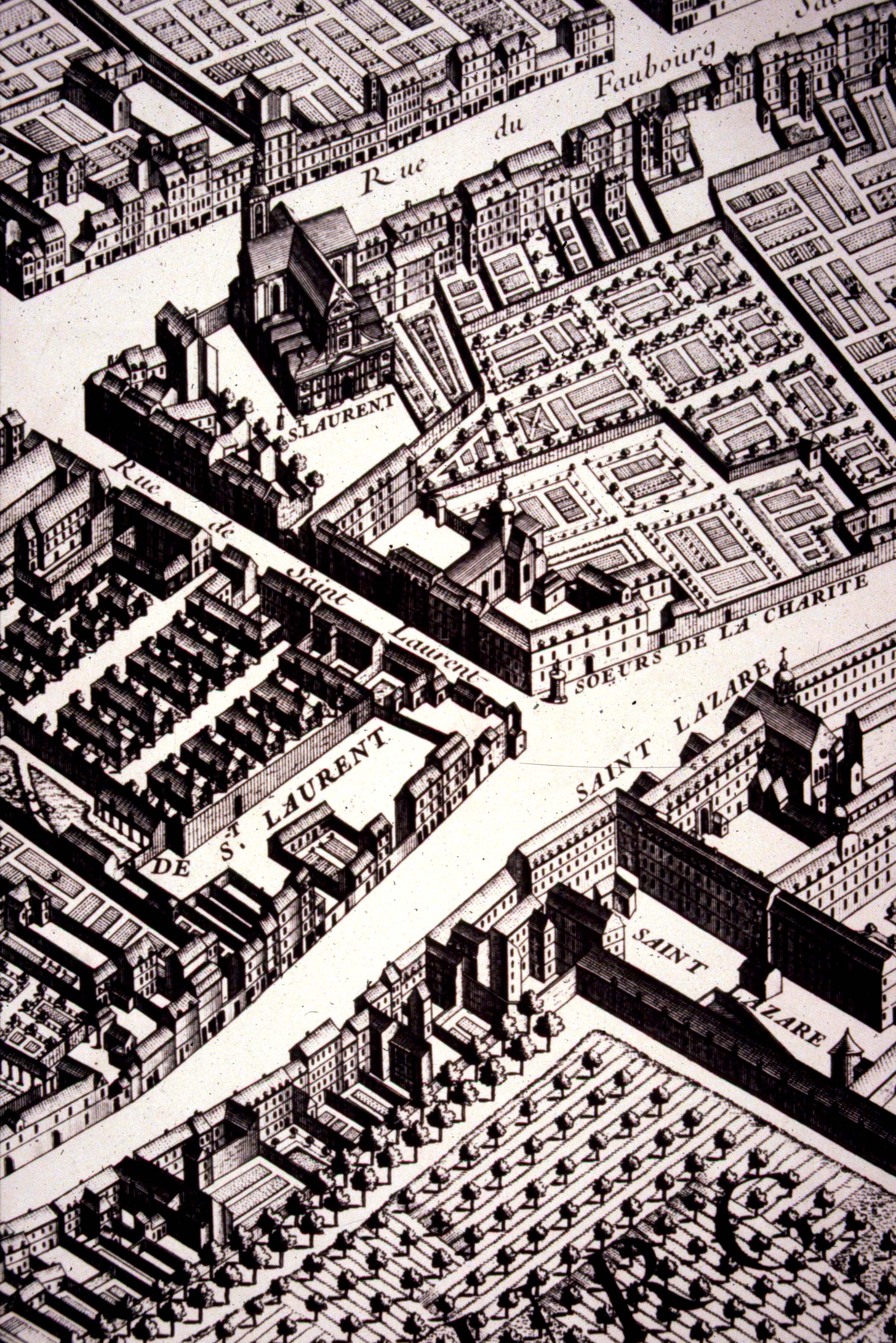 Plan de Paris de Turgot, Saint-Lazare et en face la Maison-Mère des Filles de la Charité, l'église et la Foire Saint-Laurent